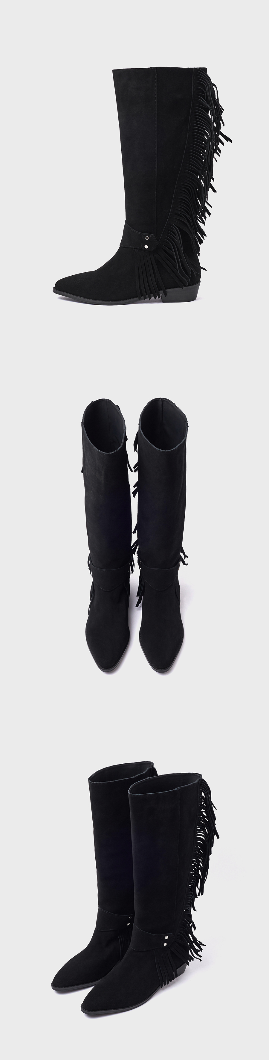 · 걸음걸이에 따라 살랑이는 프린지 장식이 멋스러운 롱부츠 · 뒷축을 따라 J라인으로 프린지를 배치하여 과하지 않은 포인트 · 웨스턴 무드를 담은 쉐입과 안정감 있는 굽 · 더블라텍스 인솔(in-sole)로 피로감을 덜어낸 착화감