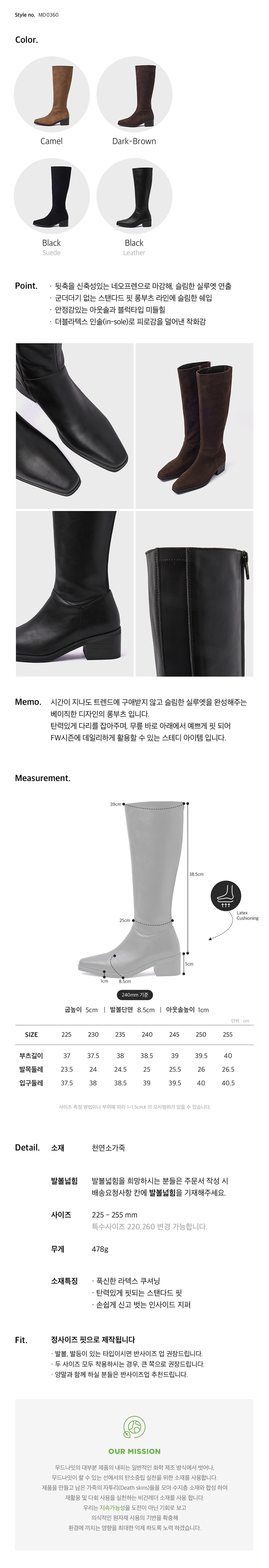 · 뒷축을 신축성있는 네오프렌으로 마감해, 슬림한 실루엣 연출 · 군더더기 없는 스탠다드 핏 롱부츠 라인에 슬림한 쉐입 · 안정감있는 아웃솔과 블럭타입 미들힐 · 더블라텍스 인솔(in-sole)로 피로감을 덜어낸 착화감