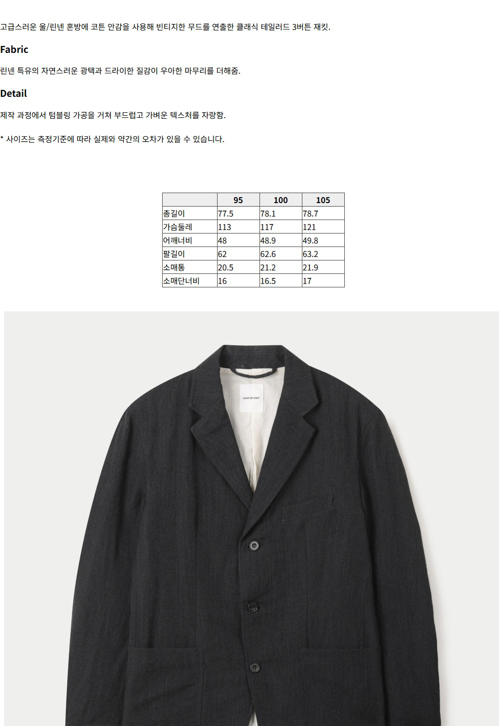시리즈 사쥬 드 크레 울 린넨 Serge 테일러드 자켓 차콜