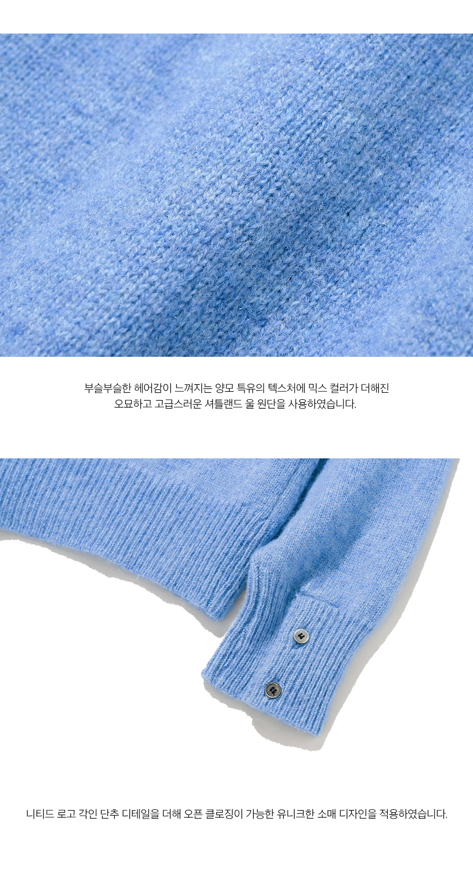 울마크컴퍼니사의 인증을 받은 100% 파인 소프트 셔틀랜드 울 원단을 사용하여 제작된 니트웨어입니다. 양모를 브러쉬 가공 및 실리콘 유연제 처리하여 거친 터치감을 보완하였고 부슬부슬한 헤어감이 느껴지는 양모 특유의 텍스처로 포근하며, 공기층이 잘 형성되어 가벼우면서도 보온성이 뛰어납니다. 다양한 색상의 원사를 믹스하여 오묘하고 고급스러운 느낌을 주고 전체 사시 봉제로 편직하여 더욱 편안하게 착용 가능하며 오픈 클로징이 가능한 소매의 단추 디테일로 유니크한 무드를 더했습니다. 베이직한 컬러와 포인트 컬러가 함께 구성되어 다양한 스타일링에 활용하기 좋으며 자연스럽게 떨어지는 세미 오버 실루엣으로 데님팬츠, 코튼 팬츠 등 여러 하의와 매치하여 멋스럽게 연출 가능한 제품입니다. * 셔틀랜드 울 특유의 소재감으로 인해 까끌까끌함을 느낄 수 있어 이너와 함께 착용을 권장합니다.