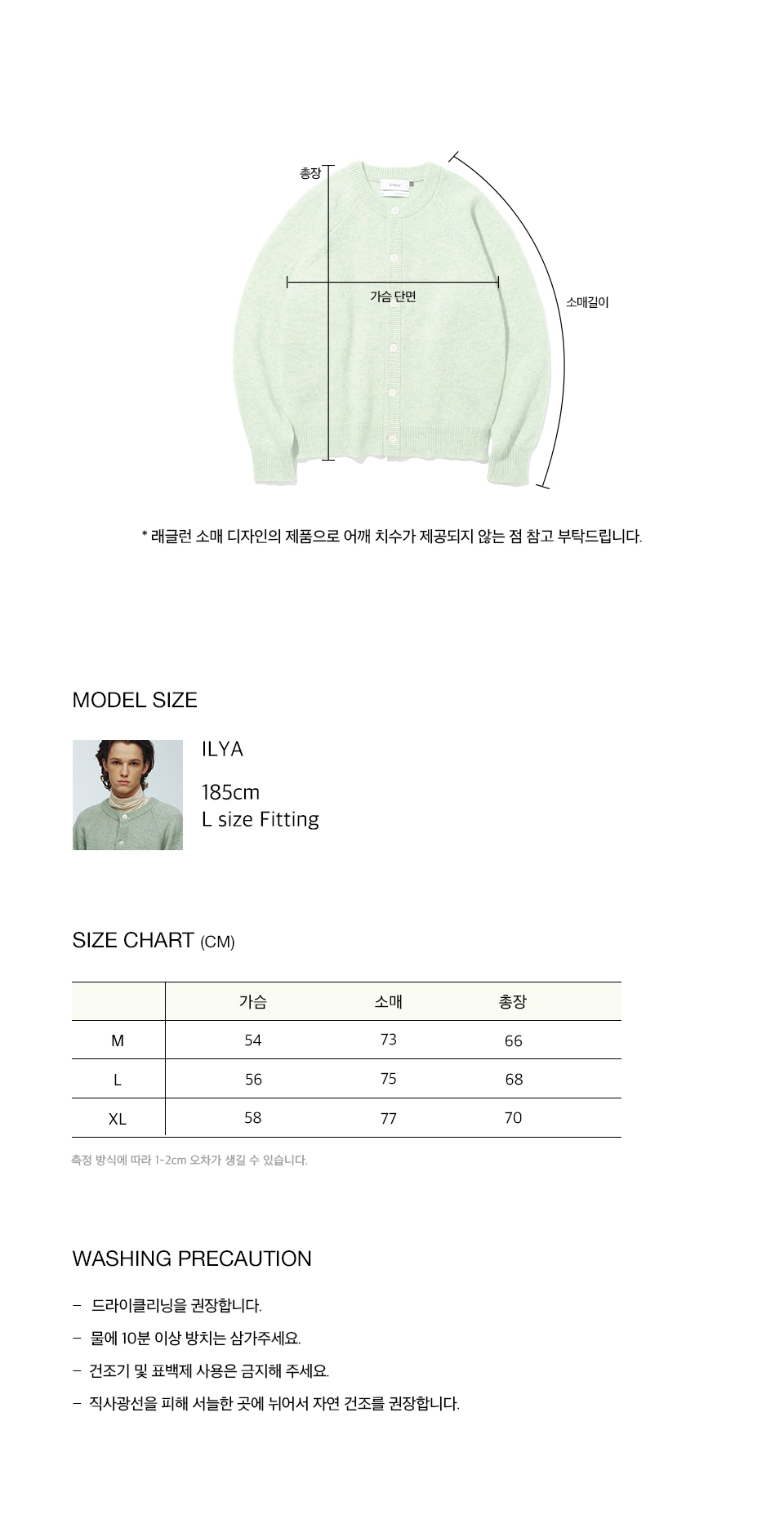 울마크컴퍼니사의 인증을 받은 100% 파인 소프트 셔틀랜드 울 원단을 사용하여 제작된 니트웨어입니다. 양모를 브러쉬 가공 및 실리콘 유연제 처리하여 거친 터치감을 보완하였고 부슬부슬한 헤어감이 느껴지는 양모 특유의 텍스처로 포근하며, 공기층이 잘 형성되어 가벼우면서도 보온성이 뛰어납니다. 다양한 색상의 원사를 믹스하여 오묘하고 고급스러운 느낌을 주고 전체 사시 봉제로 편직하여 더욱 편안하게 착용 가능하며 오픈 클로징이 가능한 소매의 단추 디테일로 유니크한 무드를 더했습니다. 베이직한 컬러와 포인트 컬러가 함께 구성되어 다양한 스타일링에 활용하기 좋으며 자연스럽게 떨어지는 세미 오버 실루엣으로 데님팬츠, 코튼 팬츠 등 여러 하의와 매치하여 멋스럽게 연출 가능한 제품입니다. * 셔틀랜드 울 특유의 소재감으로 인해 까끌까끌함을 느낄 수 있어 이너와 함께 착용을 권장합니다.
