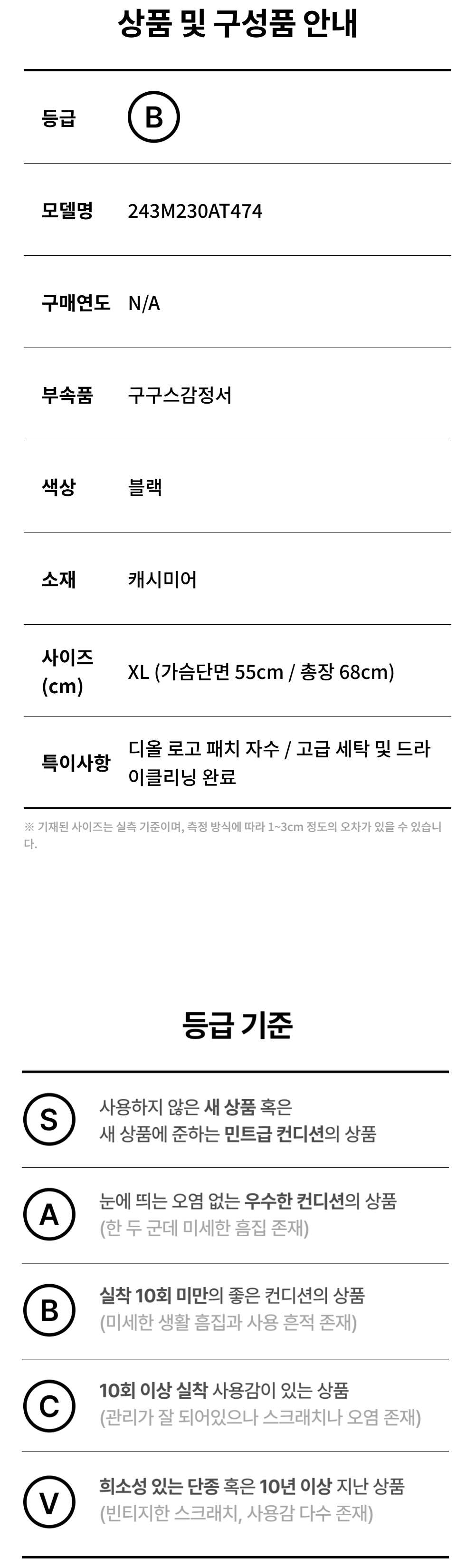 디올 243M230AT474 꾸뛰르 캐시미어 V넥 가디건 블랙 XL