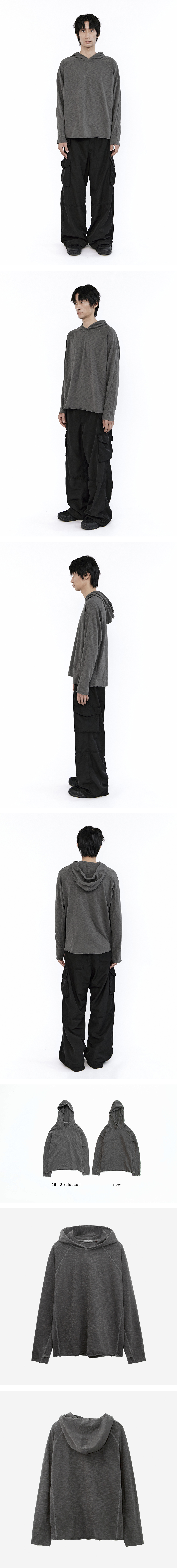 human slub hoodie - 넉넉한 크기의 후드 - 핑거홀 디테일 - 요철감이 느껴지는 슬럽 원단 - 러프한 밑단 & 소매 마감 - 사이드 패널로 입체적인 디자인 *모델: 170 중반, 마른 체형 / 3사이즈 착용 *직전 차수 대비, 금번 차수는 한 톤 어둡게 완성되었습니다.
