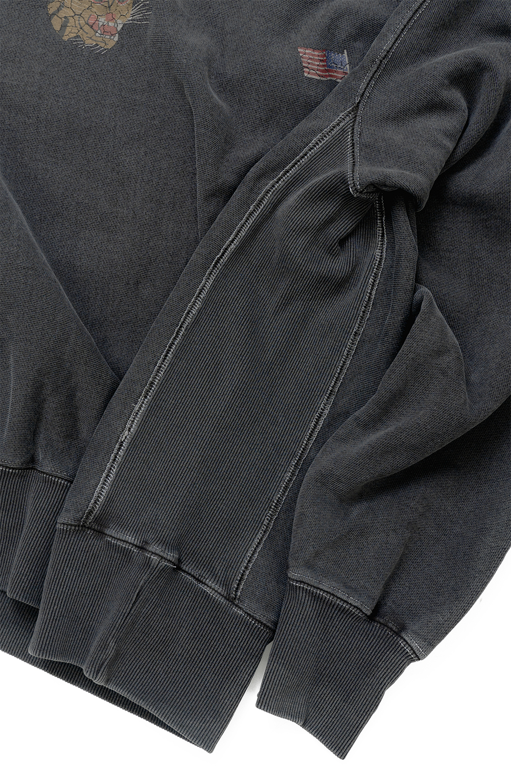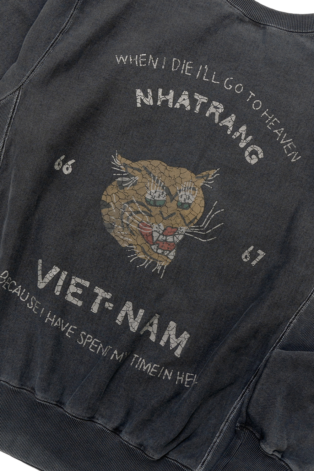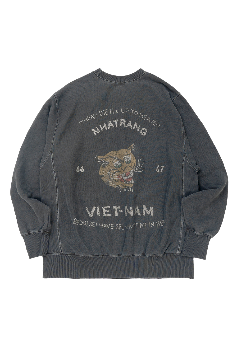 Houston Japan 22338 Pigment R/W Sweat Shirt (VIETNAM TIGER) - Black 14oz 의 코튼으로 제작한 리버스위브 스웨트 셔츠입니다. 피그먼트 다잉으로 빈티지함을 더했습니다. 가슴 양쪽과 뒷판에 베트남 자켓의 특징인 무늬를 빈티지한 크랙 프린팅한 것이 특징입니다. * Cotton 100% * 빛에 의한 제품의 색감 차이가 존재 할 수 있습니다. * Made in China