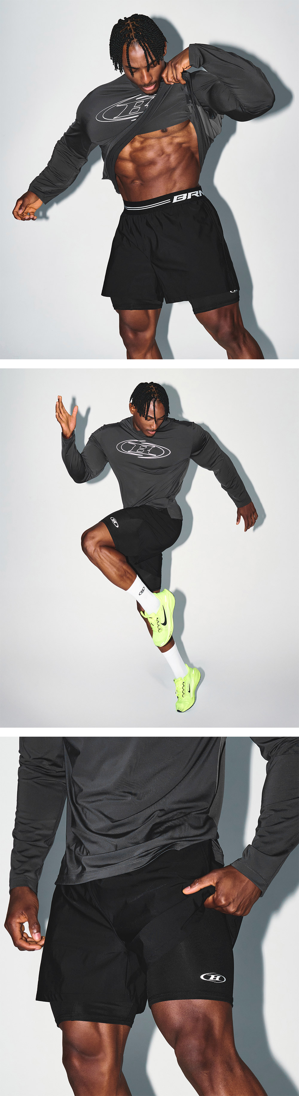 [DETAILS] * BRN 아웃밴드 투인원 스쿼트 쇼츠 - 경량 나일론 투웨이 스트레치 저지 원단 - 고탄성 BRN 로고 자카드 밴드 포인트 - 3M 리플렉티브 로고 - 소지품 수납에 용이한 레깅스 포켓 - 레깅스 내장 투인원 스타일 Material : NYLON 77% POLYURETHANE 23% Fitting : EM 3 Size, 182cm, 87kg