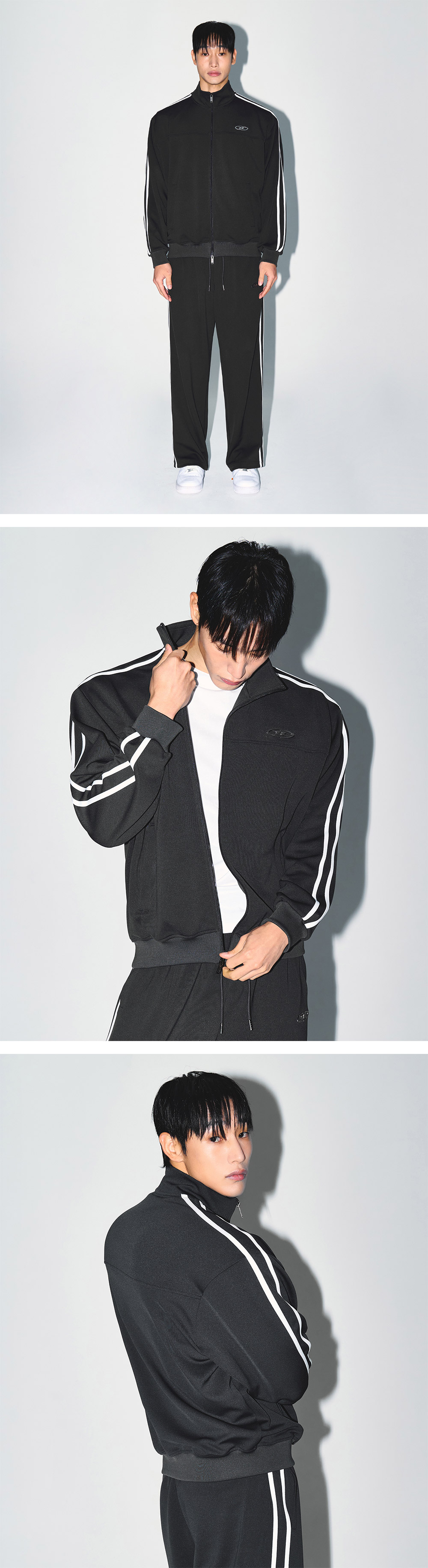[DETAILS] * 크롬 B 저지 트랙 자켓 - 쿠션감 있는 폴리 원단 - 트랙 라인 디테일 - 지퍼 포켓 - 하이넥 디자인 - 레귤러핏 Material : POLYESTER 100% Fitting : MK 2 Size, 181cm, 71kg