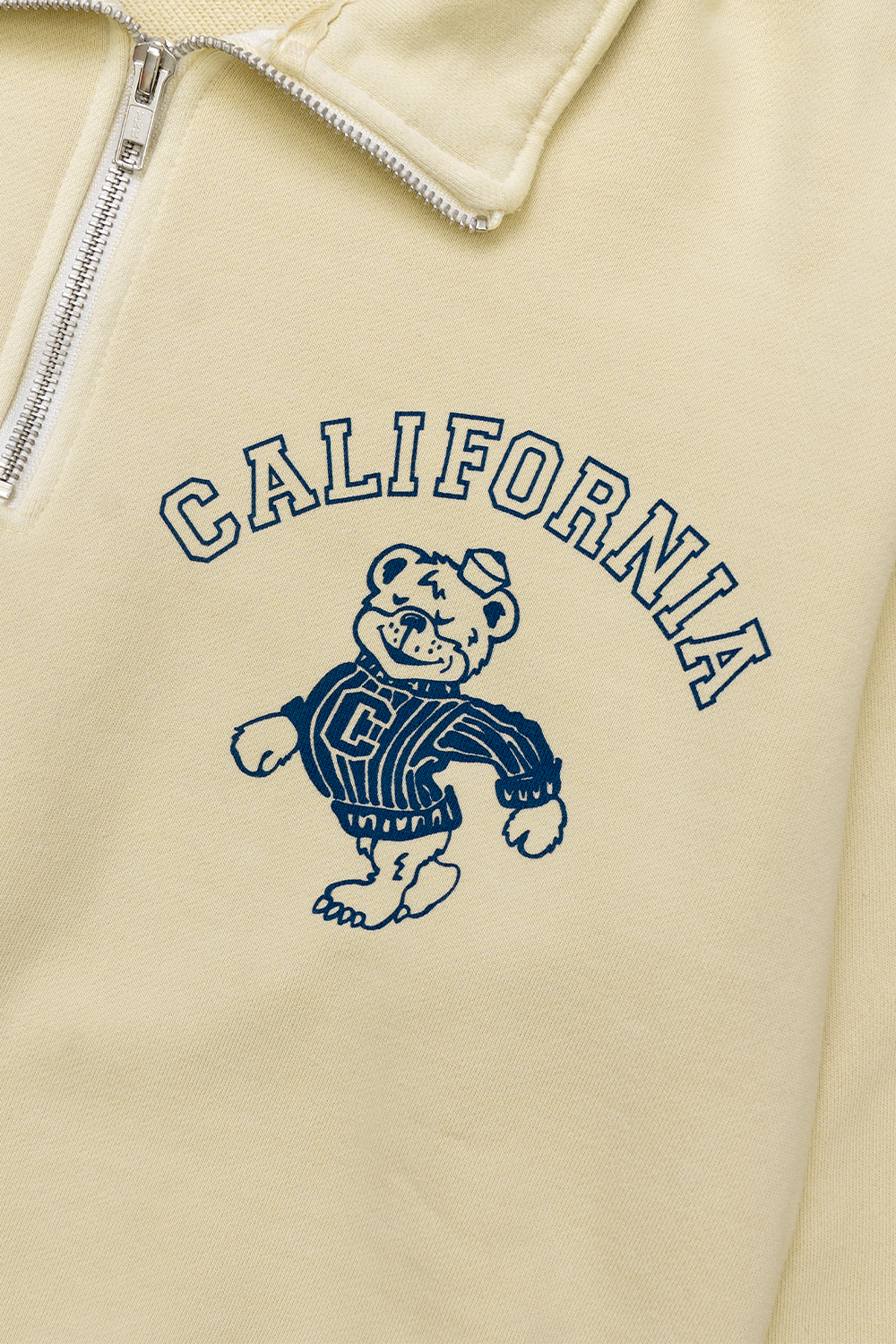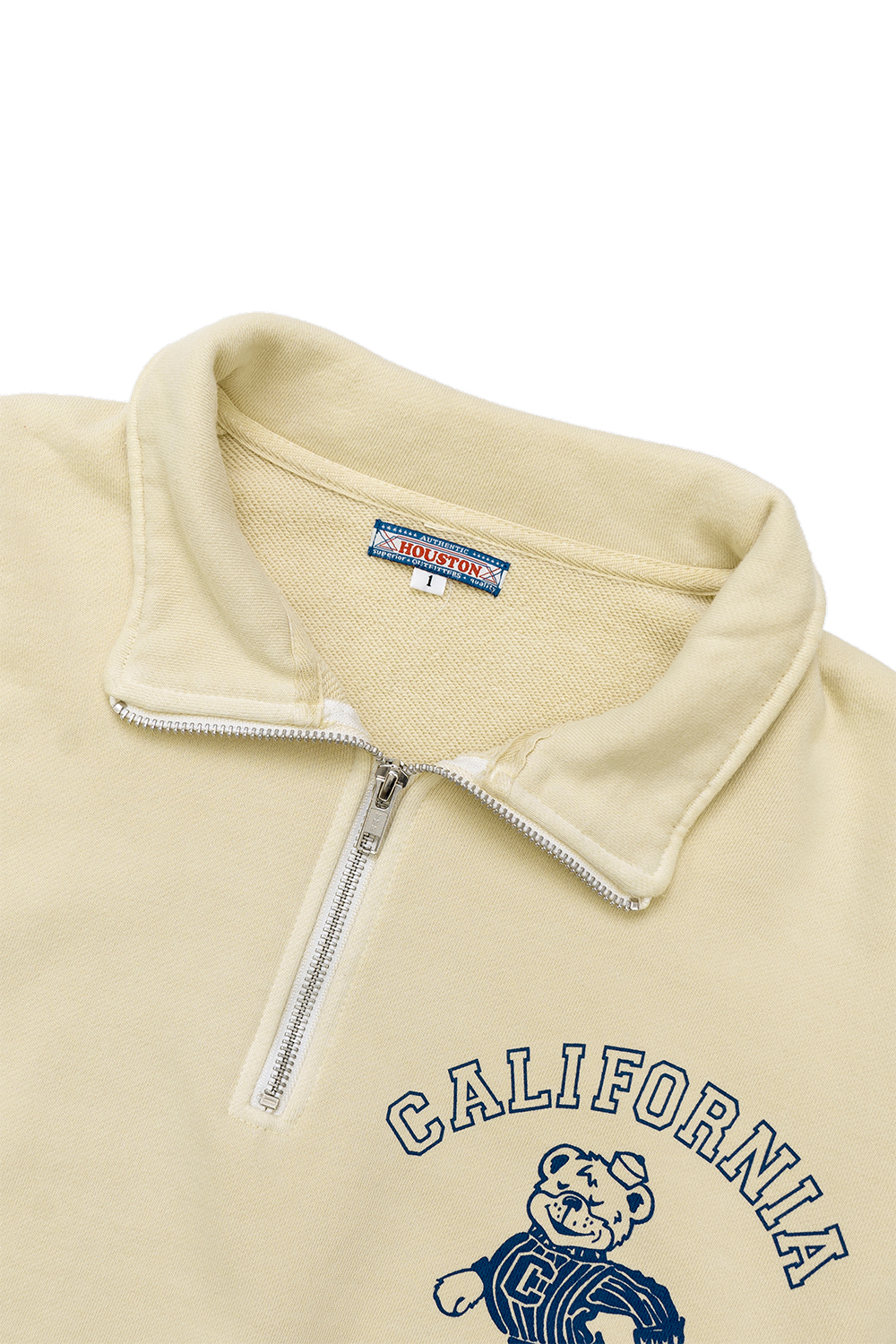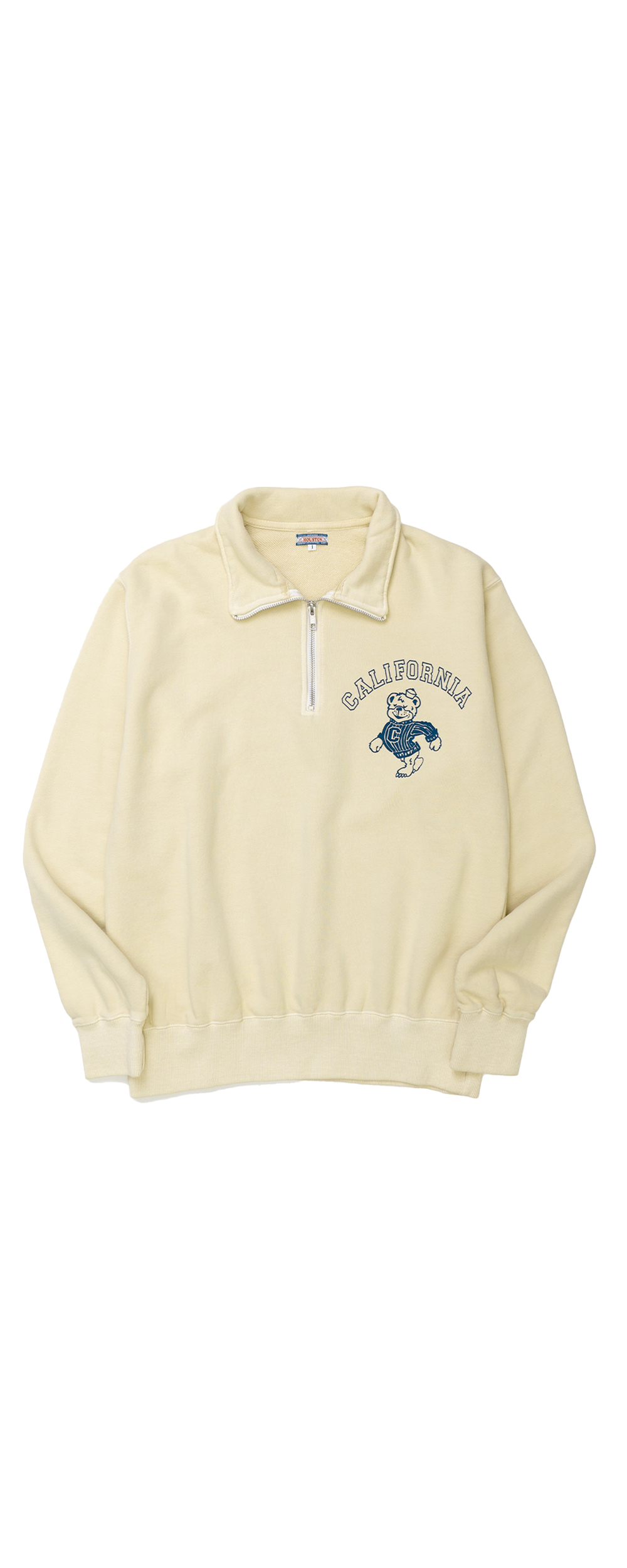 Houston Japan 2032W Pigment Print Half Zip Sweat (CALIFORNIA) - Cream 적당한 품의 여유있는 실루엣, 컴팩트한 길이감의 하프 집업 스웻 셔츠입니다. 왼쪽 가슴에 '칼리지조(College Joe)'의 곰 로고를 프린트한 것이 특징입니다. 피그먼트 가공하여 빈티지함을 더했습니다. * Cotton 100%