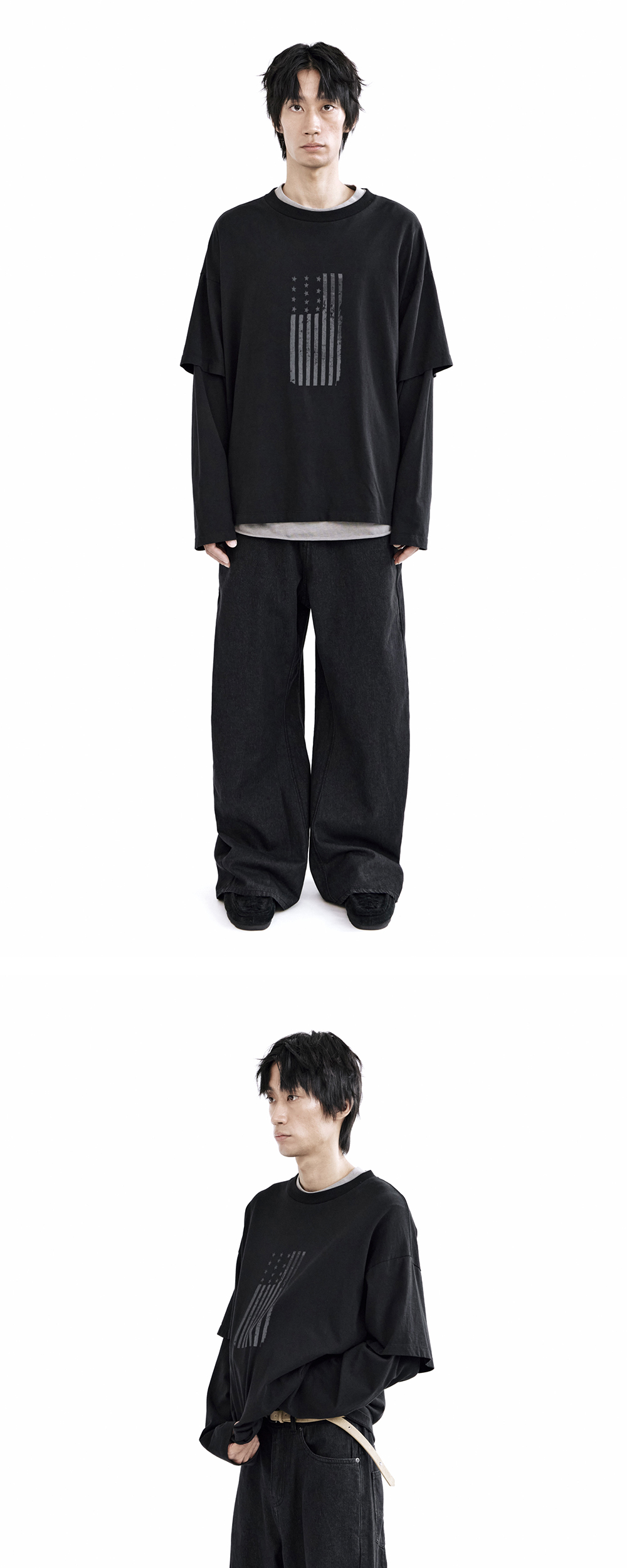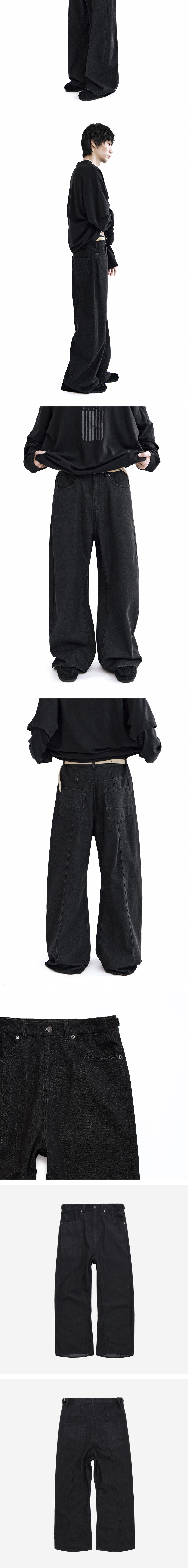 curved denim pants - black, indigo - 고시마 팬츠 기반, 유려한 곡선의 형태로 변주를 준 커브드 데님 팬츠 - 인심 및 아웃심에 사이드 패널 적용하여 완성한 입체적인 실루엣 - 러프해보이는 겉 텍스쳐, 그와 상반되는 부드러운 착용감 - 전/후면 밑단 단차 - 후면 다트 디테일 - 가먼트 째로 워싱 - 사이드 어드저스터 *모델: 170 중반 / 마른 체형, 3사이즈 착용 *일반 체형 기준 - 170cm 초반 이하 2사이즈 권장 - 170cm 중반 3사이즈 권장 - 170cm 후반~180cm 초반 4사이즈 권장