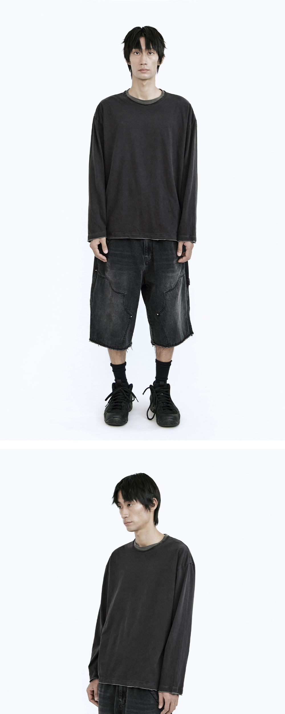 layered long sleeves - 2가지 컬러의 컷아웃 레이어링이 적용된 롱 슬리브 티셔츠 - 사용감이 강조되는 강한 워싱 가공 - 부드러운 터치감 & 필링감 - 후면 넥라인 ~ 어깨 체인스티치 마감 *모델: 170 중반, 마른 체형 / 3사이즈 착용 *금번 차수는 직전 차수 대비, 미세하게 연하게 완성됐습니다.
