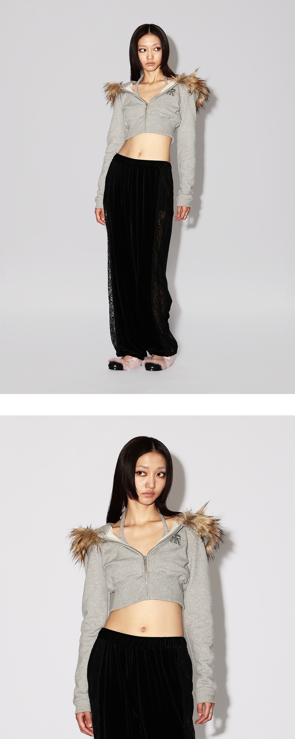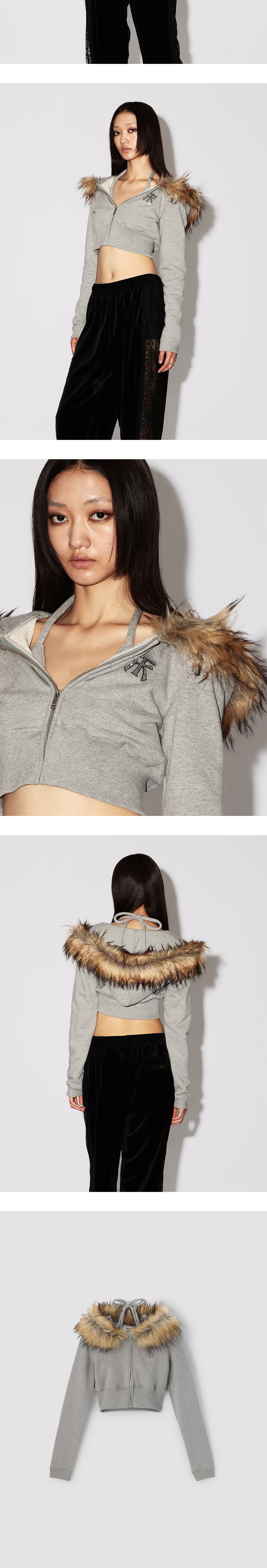 앰부시 우먼 홀터 넥 후디 그레이입니다. - 브라운 모피 후디 - 크롭 기장 - 로고 자수 포인트 - 홀터넥 디자인