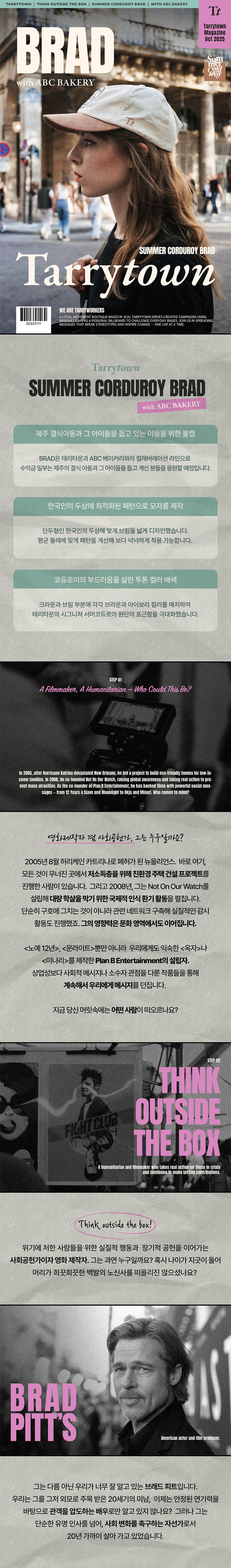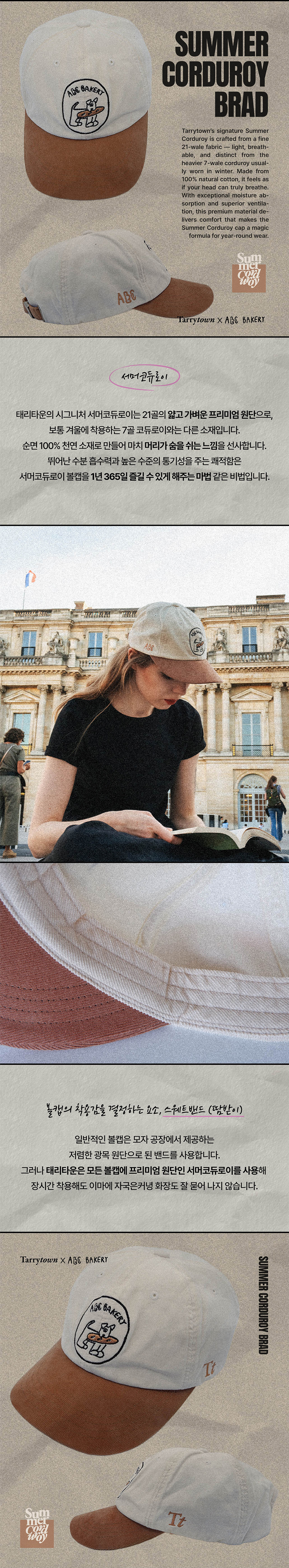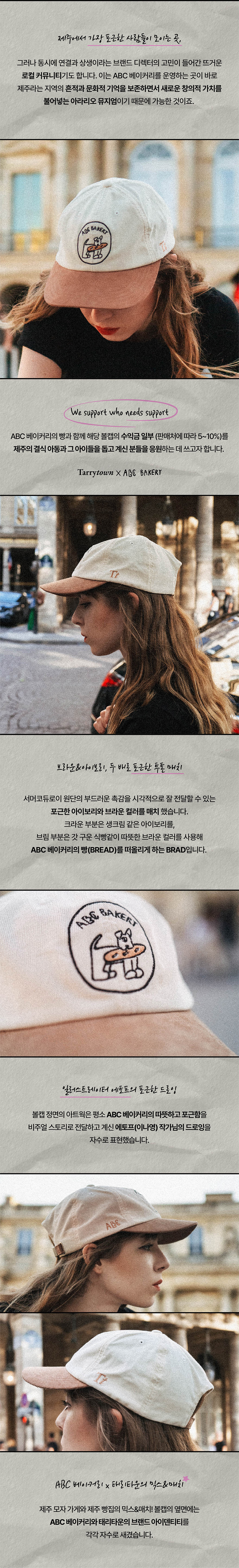 [ABC 베이커리와 태리타운과의 컬래버레이션 볼캡 BRAD] • 제주 결식아동과 그 아이들을 돕고 있는 이들을 응원하는 볼캡 • 일러스트레이터 에토프 작가의 드로잉 작품을 자수로 표현 • 한국인 두상에 최적화된 패턴으로 제작 • 코듀로이의 부드러움을 살린 투톤 컬러 배색