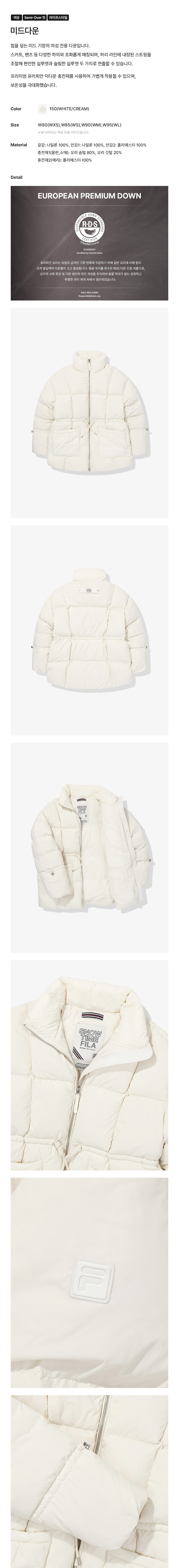 힙을 덮는 미드 기장의 여성전용 다운입니다.스커트, 팬츠 등 다양한 하의와 조화롭게 매칭되며허리라인에 스트링이 내장되어 있어편안한 실루엣과 슬림한 실루엣 두가지 방법으로 연출 가능합니다.프리미엄 유러피안 덕다운 충전재를 사용하여 착용시 가볍고 보온성 극대화 하였습니다.