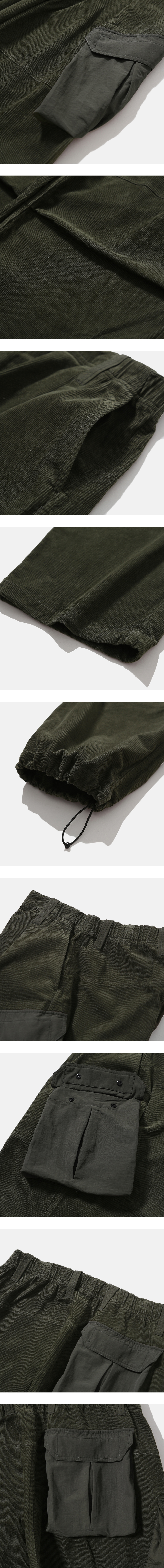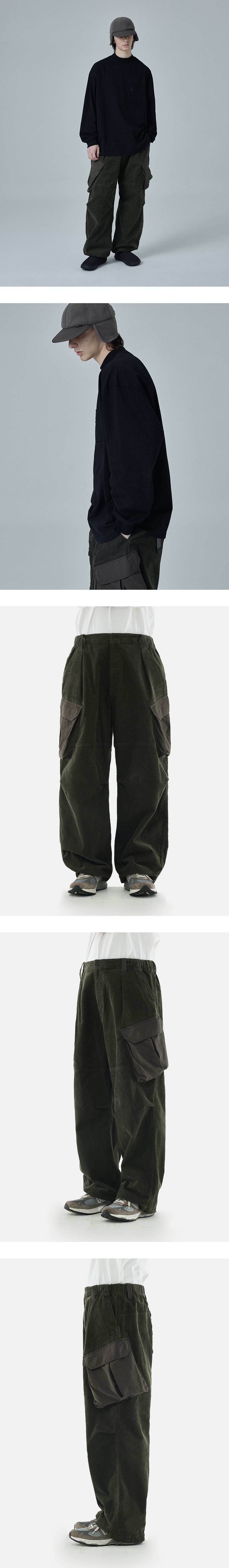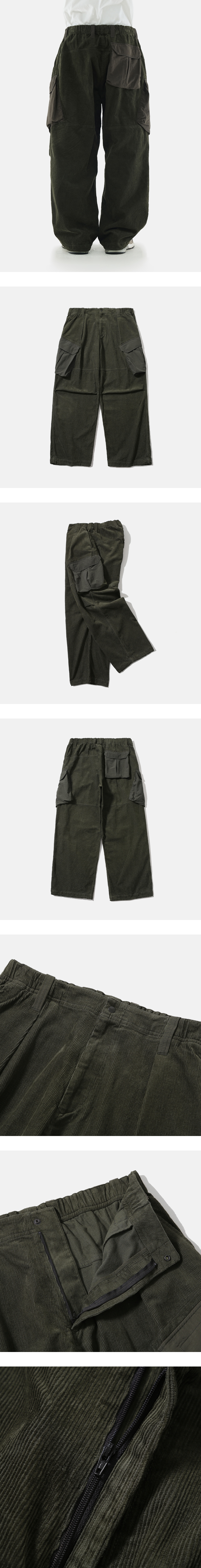 넉넉한 수납공간을 갖춘 밀리터리 팬츠 · 여유롭고 편안한 느낌의 실루엣. · 따뜻하고 부드러운 촉감의 코듀로이 원단 사용. · 스냅 여밈의 입체 분량이 있는 카고 포켓과 뒷 주머니 사양. · 오른쪽 사이드 주머니 내부에 열쇠 등을 걸 수 있는 고리 디테일. · 허리와 무릎에 턱을 넣어 편안한 착용감과 풍성한 실루엣 연출. · 신축성 있는 내장형 이밴드와 벨트 고리가 달린 허리. · 실루엣 조절이 가능한 밑단 스트링으로 2가지 타입으로 연출 가능.