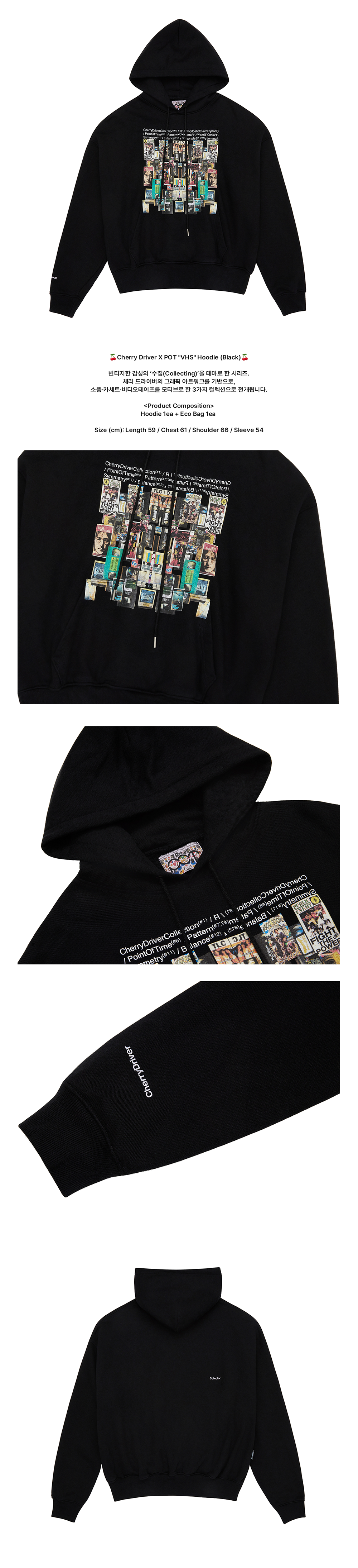 🍒Cherry Driver X POT "VHS" Hoodie (Black)🍒 빈티지한 감성의 ‘수집(Collecting)’을 테마로 한 시리즈. 체리 드라이버의 그래픽 아트워크를 기반으로, 소품·카세트·비디오테이프를 모티브로 한 3가지 컬렉션으로 전개됩니다. <Product Composition> Hoodie 1ea + Eco Bag 1ea Size (cm): Length 59 / Chest 61 / Shoulder 66 / Sleeve 54
