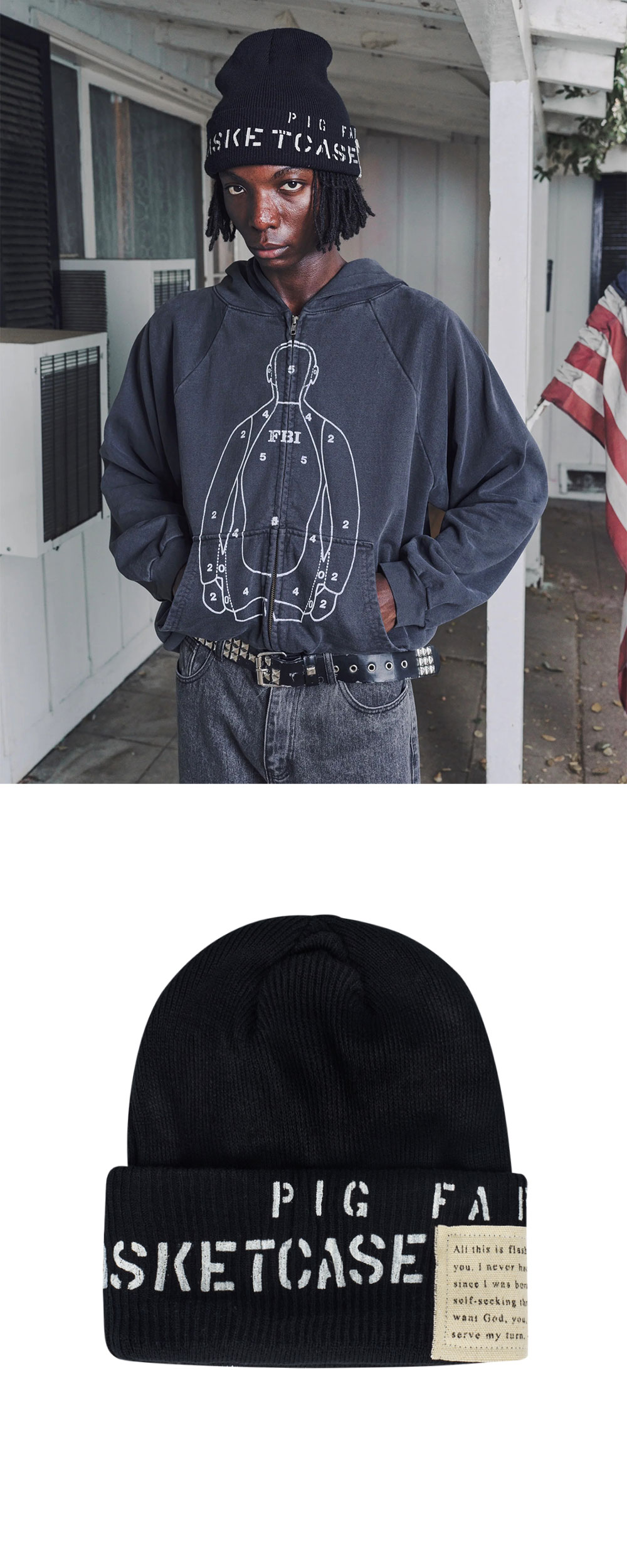 바스켓케이스 피그팜 비니 블랙입니다. - 군모에서 영감을 받은 롤업 디자인 - 전면 피그팜 그래픽 프린트 - 사이드 캔버스 패치 포인트 - 원사이즈