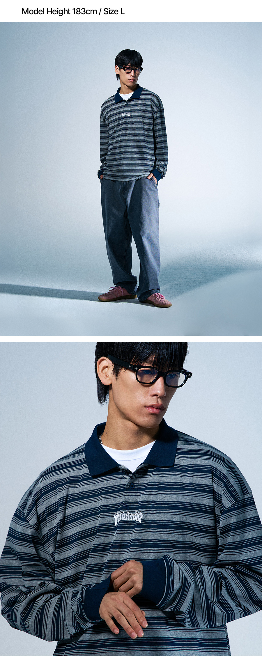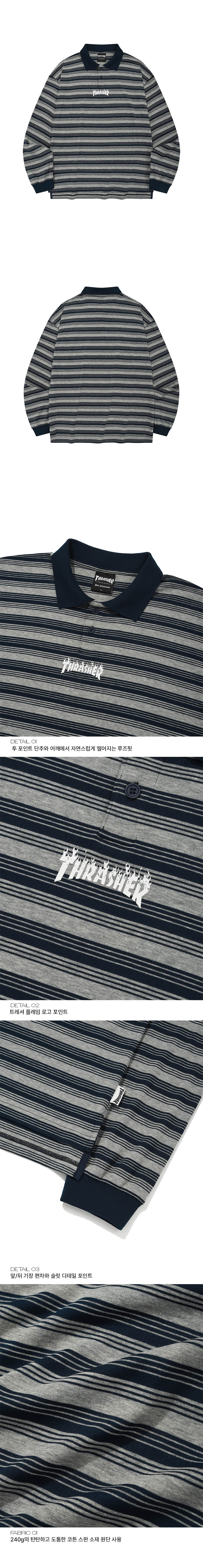 THRASHER Flame Collar Stripe Long Sleeve Navy