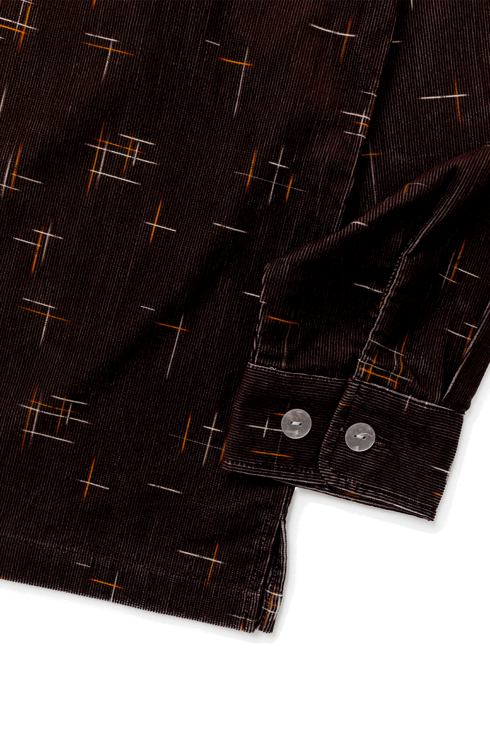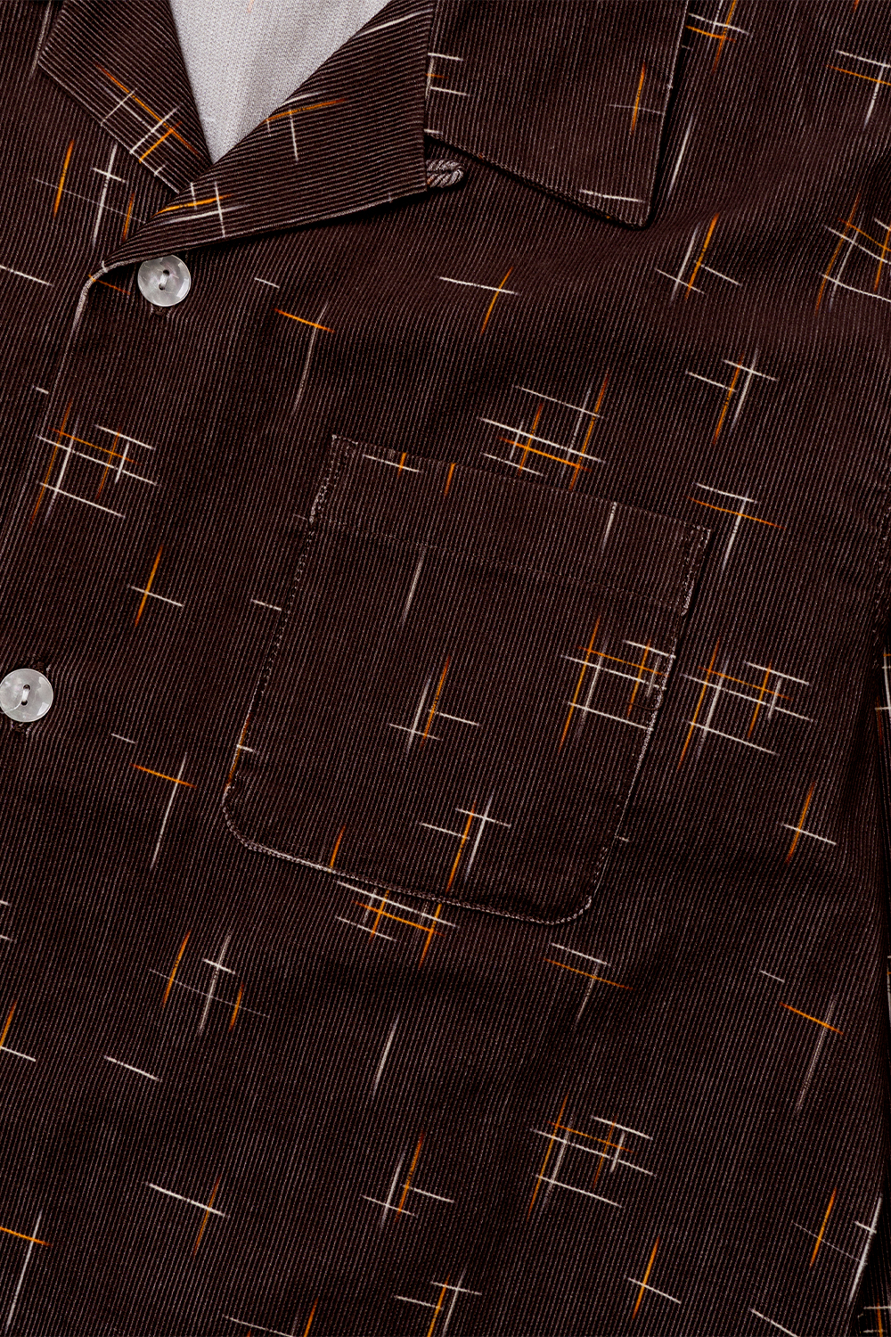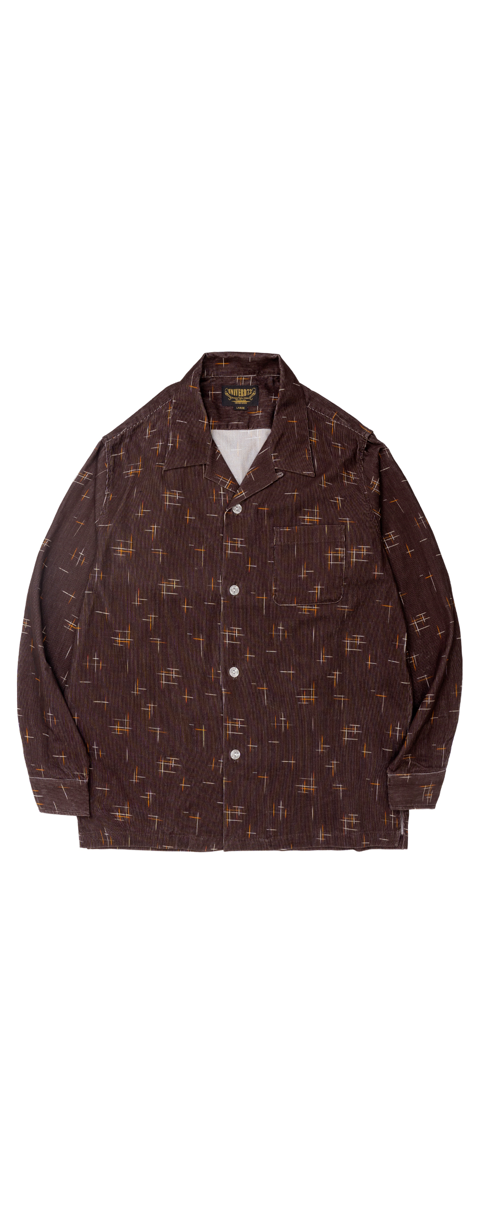 Univerd72 41262 Print Corduroy Shirt (KASURI) - Brown 16W 코듀로이 원단을 사용한 긴팔 셔츠입니다. 50년대 비백 무늬의 그래픽을 디지털 프린트로 보디 컬러마다 프린트한 것이 특징입니다. 버튼 같은 경우 조금 파인 모양인 클리어 버튼을 채용한 제품입니다. 단품 및 이너로도 포인트를 줄 수 있는 제품입니다. * Cotton 100% * 빛에 의한 제품의 색감 차이가 존재 할 수 있습니다. * Made in China