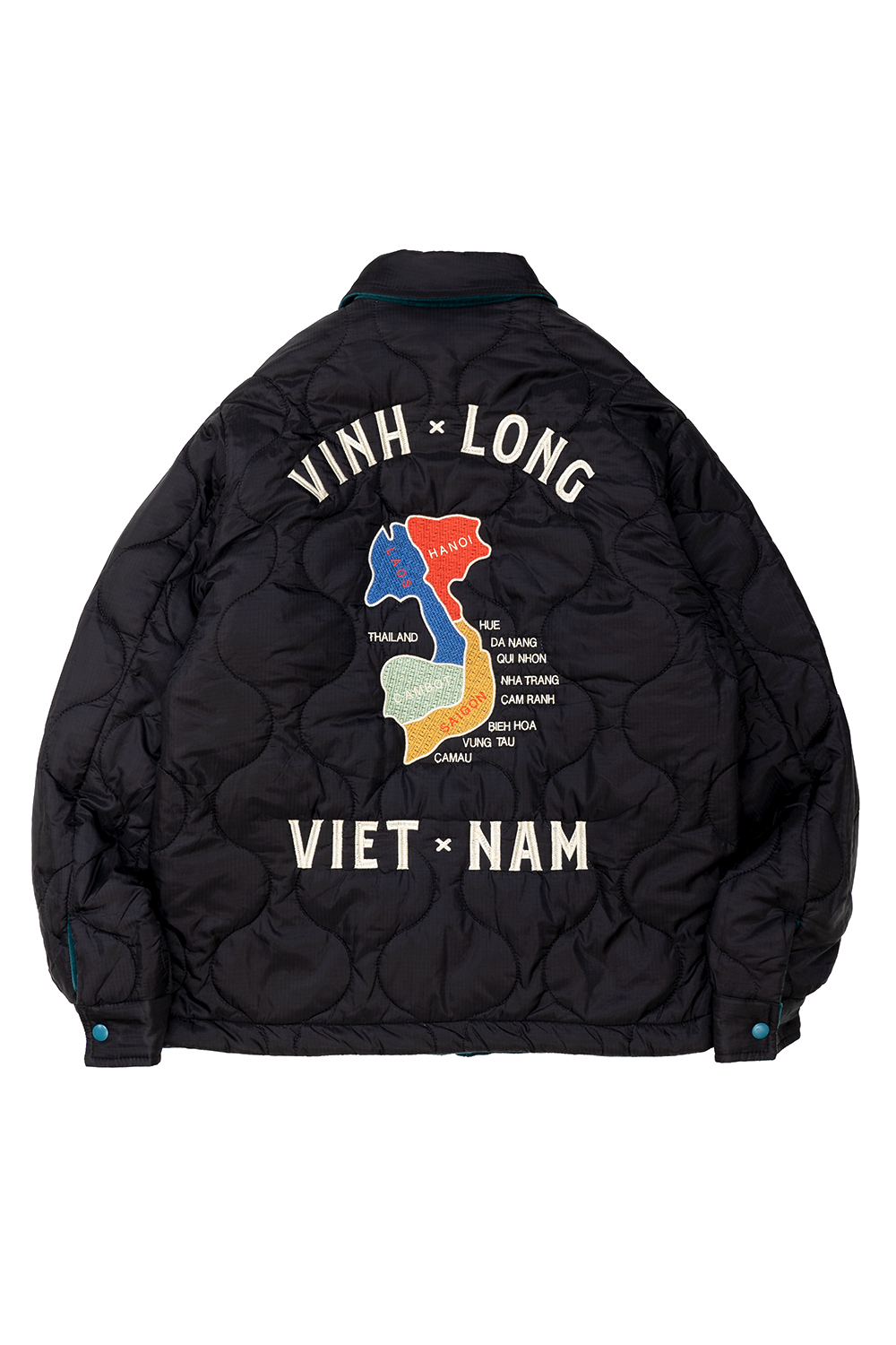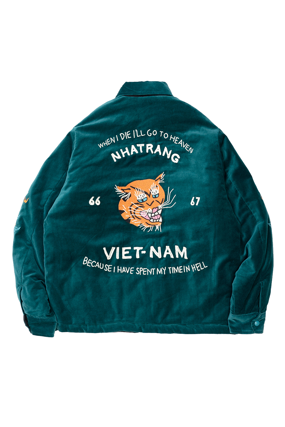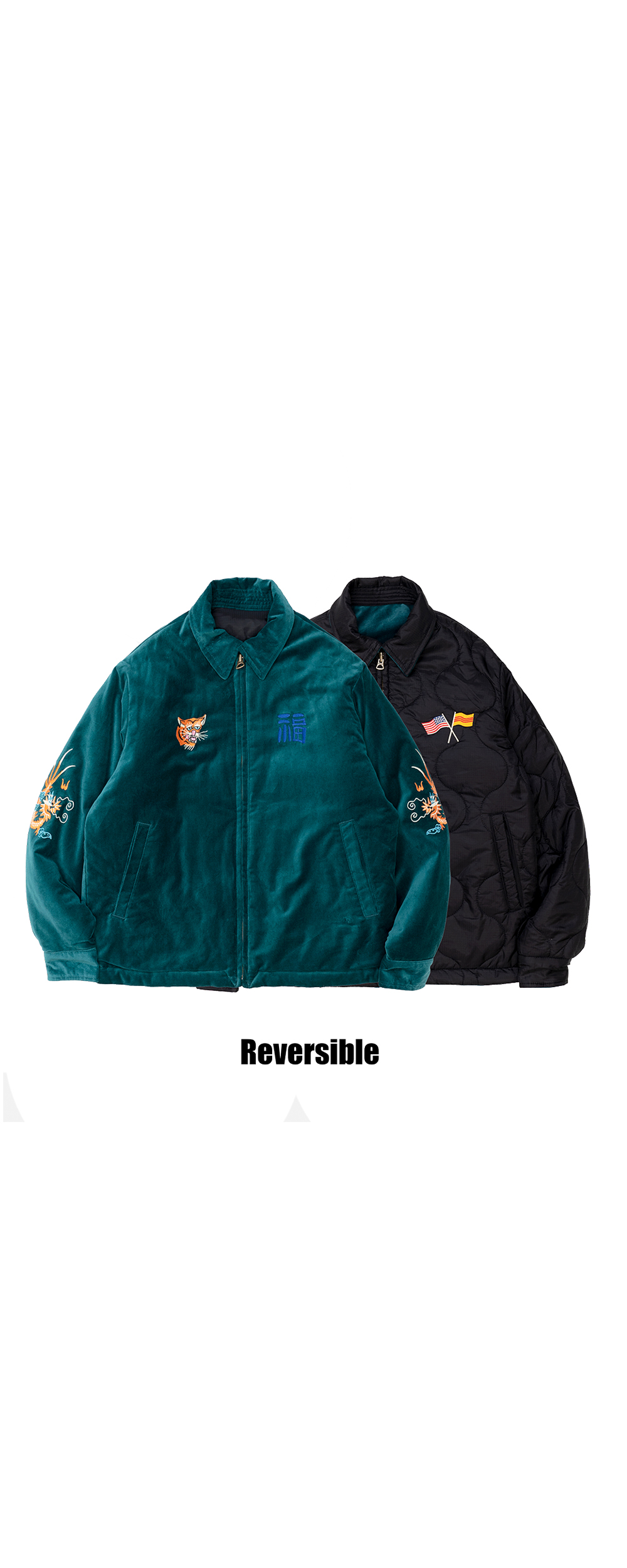 Houston Japan 51517 51515 Reversible Vietnam Jacket - Green (GRxBK) 리버시블 베트남 자켓입니다. 고급스러운 벨벳과 높은 내구성을 가지는 나일론 립스탑 원단을 사용하였습니다. 양면 모두 빈티지 베트남 자켓의 무늬를 모티브로 상이한 자수가 놓여져 있습니다. * Velvetten : Cotton 100% * Quilting : Nylon 100% * 빛에 의한 제품의 색감 차이가 존재 할 수 있습니다. * Made In China