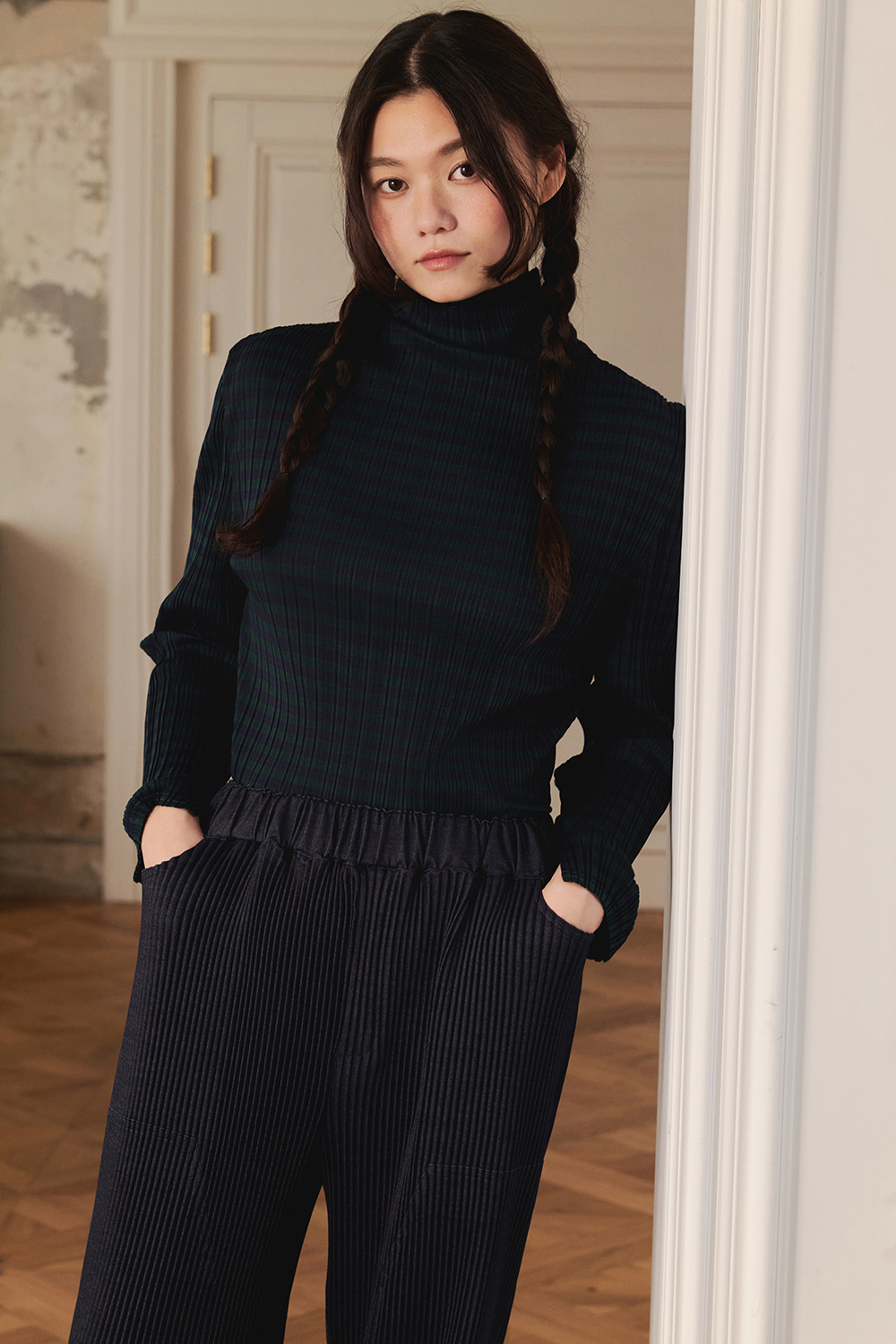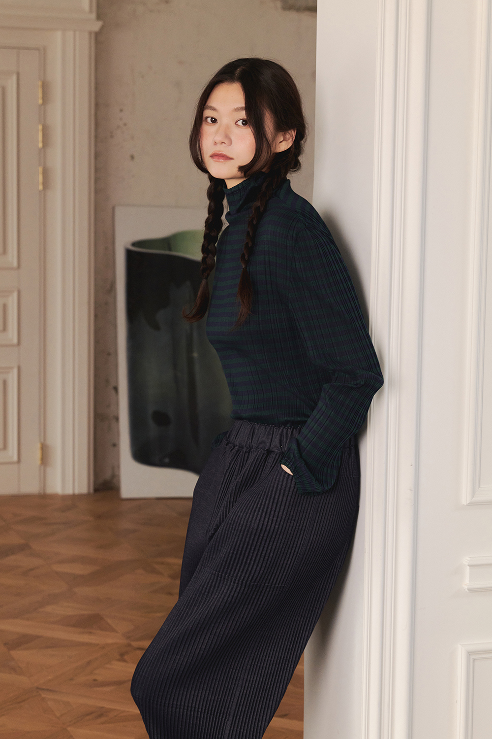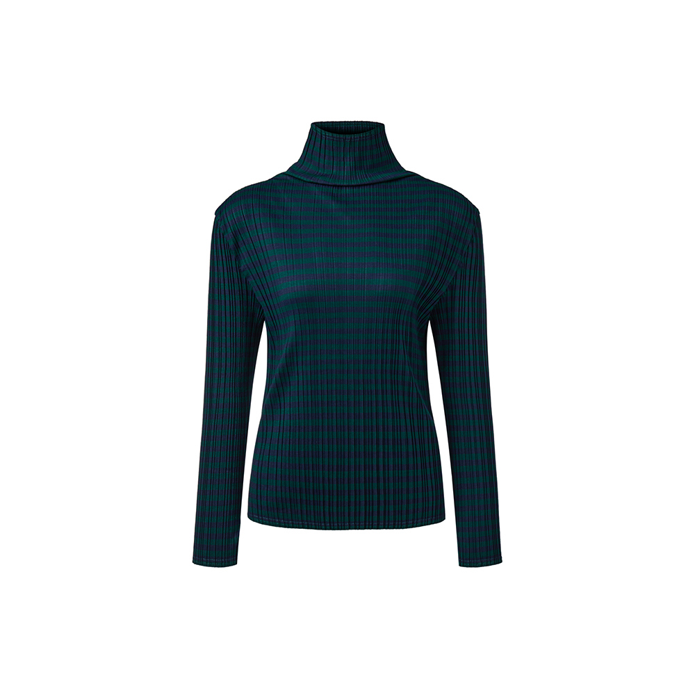 몽플리쎄 여성 저지 스트라이프 하이넥 플리츠 티셔츠 그린