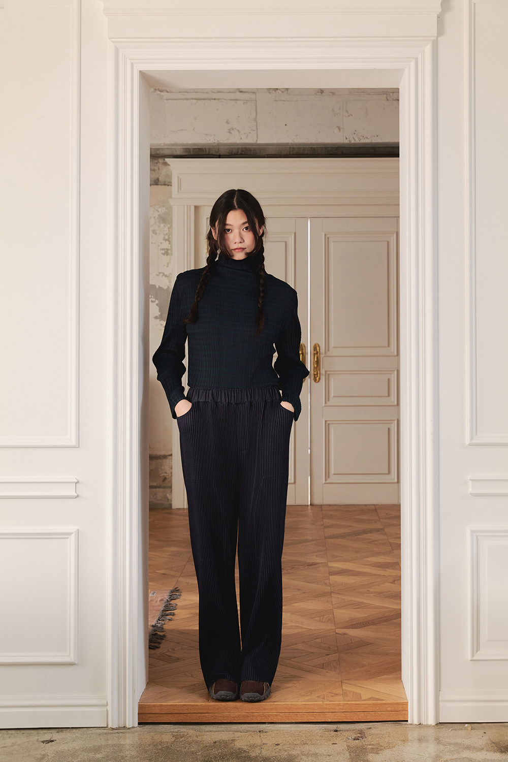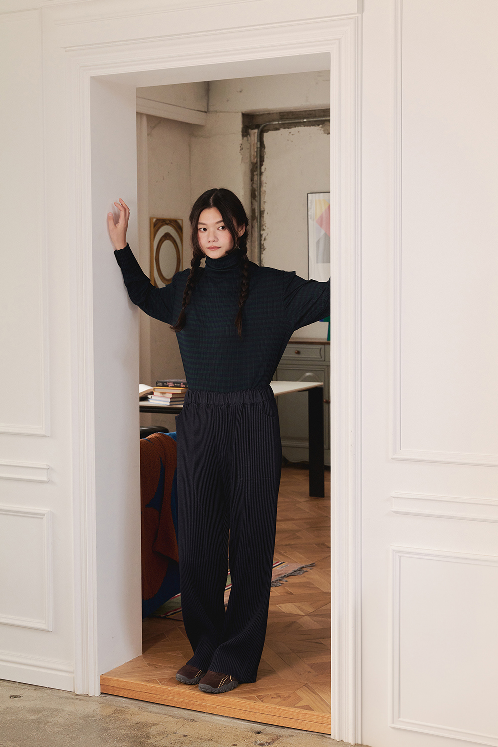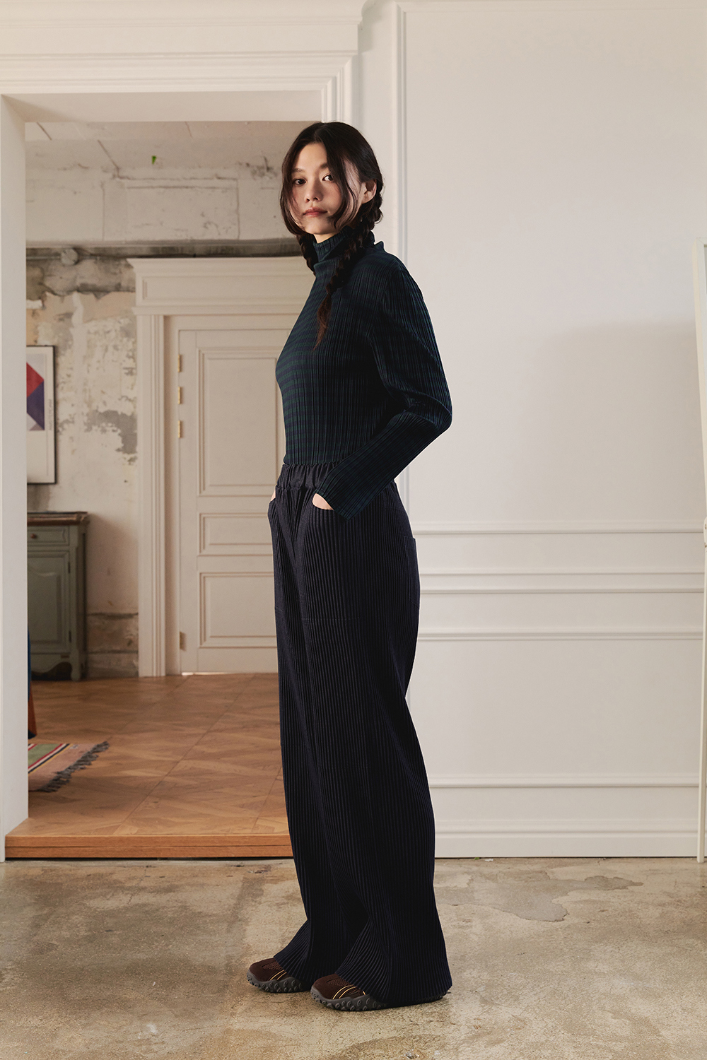 몽플리쎄 여성 저지 스트라이프 하이넥 플리츠 티셔츠 그린
