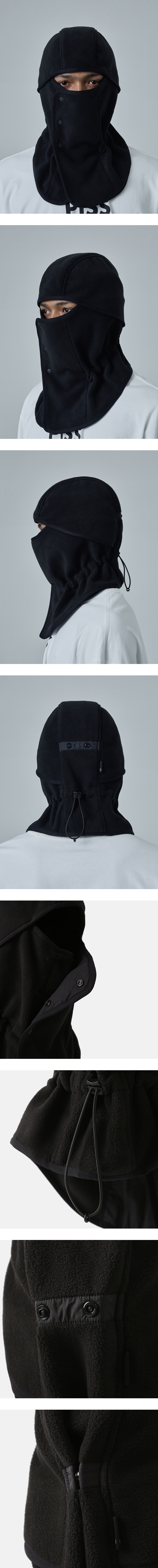 보온성을 갖춘 겨울철 포인트가 되는 아이템 · 추운 날씨에 얼굴과 목을 보호해 주는 바라클라바. · 안팎이 모두 매끈하고 부드러운 푹신한 플리스 원단 사용. · 따뜻한 공기는 품고 습기는 발산하여 쾌적하고 보온성이 뛰어남. · 후면부 스냅과 스토퍼를 활용하여 사이즈 및 실루엣 조절 가능. · 후면부 모이프 심볼 포인트 라벨 부착.