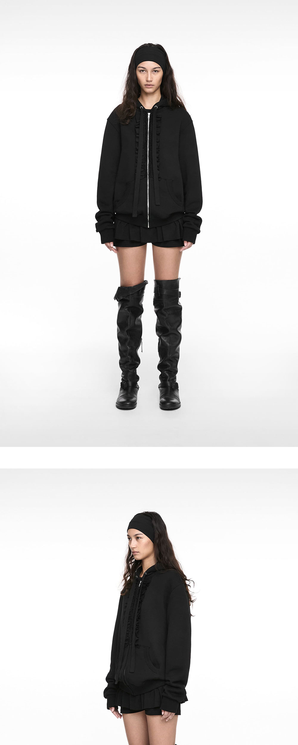 나체 우먼 러플 쇼트 팬츠 블랙입니다. - 셔링 디테일이 돋보이는 스커트형 팬츠 - 마이크로 미니 기장으로 컨템포러리한 무드 연출 - 부드럽고 유연한 소재 - 허리 니트 스트랩