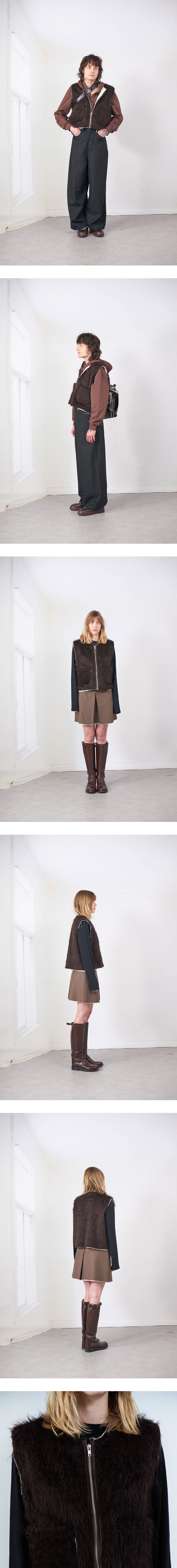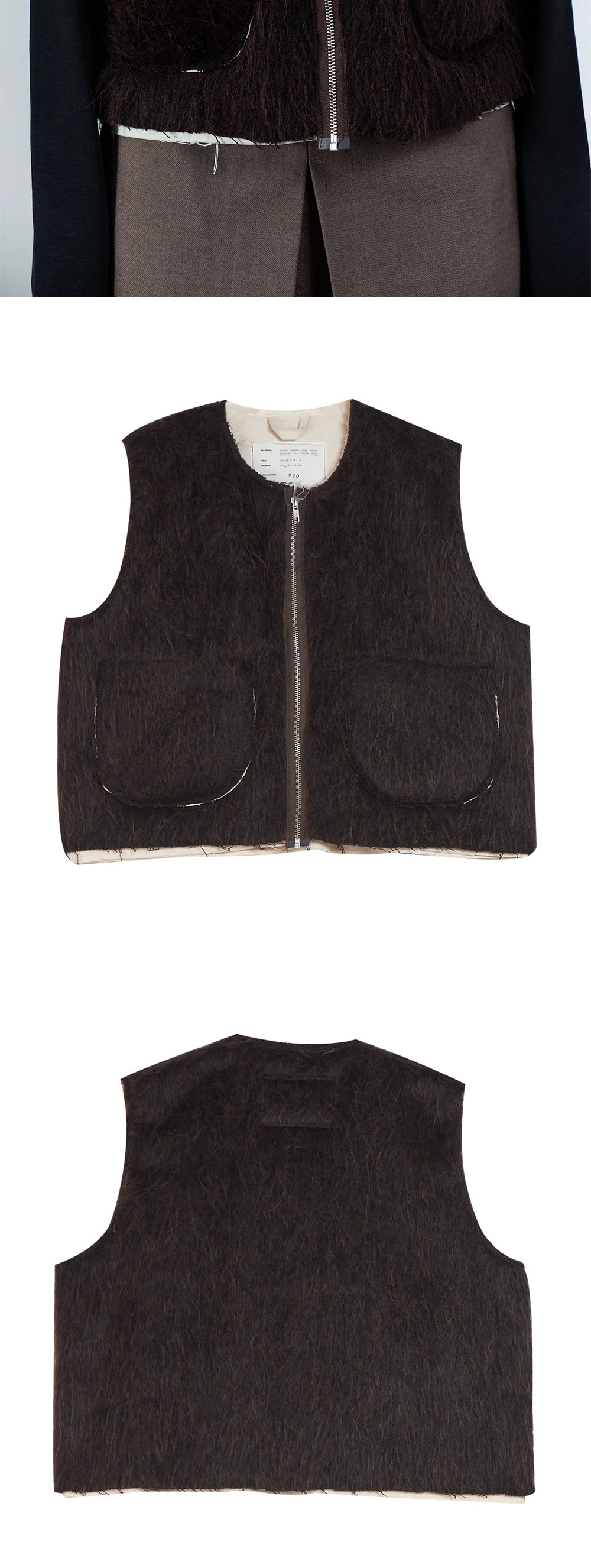 카미엘 포트젠스 스퀘어 집 베스트 브라운입니다. - 헤어리 울 혼방 집업 베스트 - 박시 실루엣 - 캔버스 안감 노출 - 패치 포켓 - 로우 엣지 마감