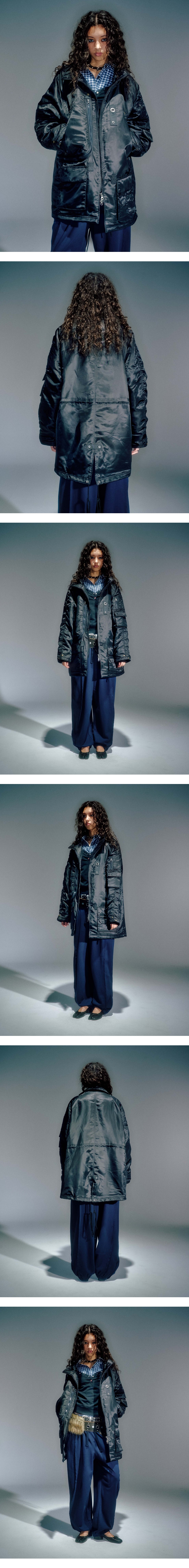 전면부 입체 포켓 디테일 소매 더블 포켓 디테일로 수납공간 확보 밀리터리 웨빙 디테일 베이컨트 제작 리벳 사용 빈티지한 올풀림 연출 YKK 2WAY 지퍼 사용 내부 충전재 사용 S / M / L (CM) Length : 87 / 89 / 91 Bust : 69 / 71 / 73 Sleeve : 86 / 91 / 93 Model is 172cm and is wearing a size S SHELL : POLYESTER 100% LINING 1 : POLYESTER 100% LINING 2 : POLYESTER 100% 1. 단독 드라이클리닝 하십시오. 2. 장식 및 고무제 라벨 다림질을 금지합니다. 3. 기계 건조 사용을 금지합니다. 4. 탈착이 불가능한 장식물은 은박지로 싼 후 클리닝 하십시오. 5. 올 뜯김 및 필링에 주의하십시오. 6. 이염 및 변색을 주의하십시오. 7. 가열 제품의 사용을 절대 금합니다. 8. 난방 기구 등 열기 가까이 두지 마십시오. 9. 자수 및 프린트 부분에 마찰이 생기지 않도록 주의하세요.