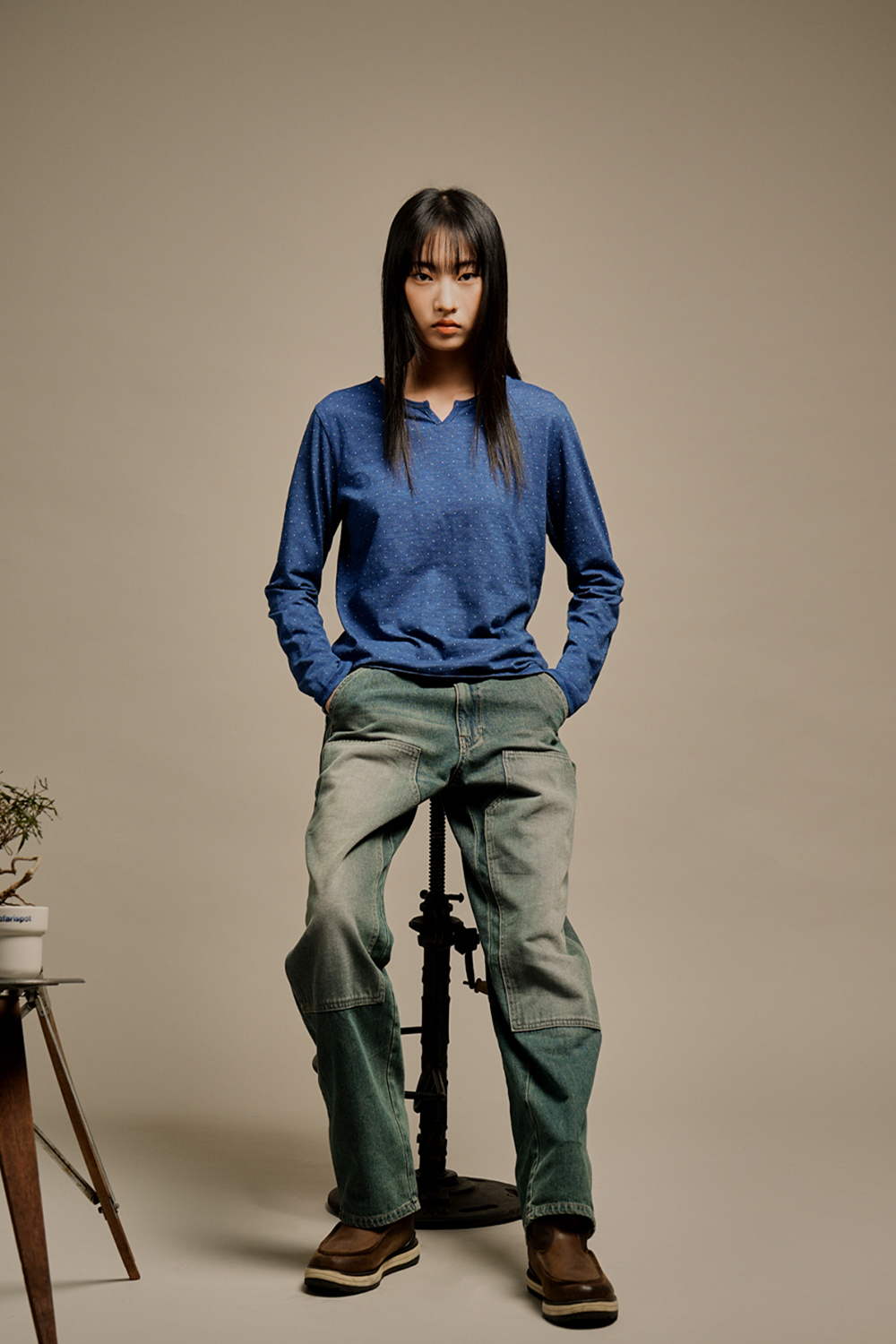 사파리스팟 1/2 컨트리 도트 브이넥 롱 슬리브 인디고