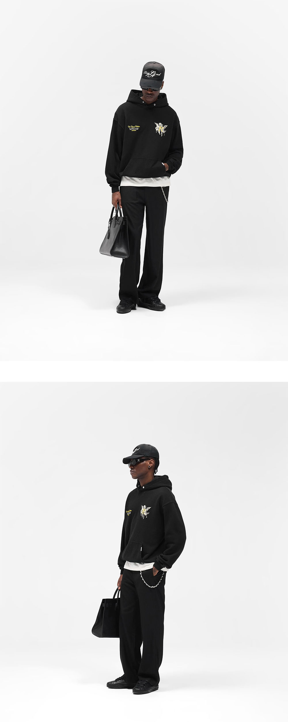 리프레젠트 레거시 체럽스 후디 제트 블랙입니다. - 헤비 코튼 후드 티셔츠 - 오버사이즈 핏 - 리브 밑단 & 커프스 - 포켓에 시그니처 메탈 바 - 레거시 케럽스 아트워크