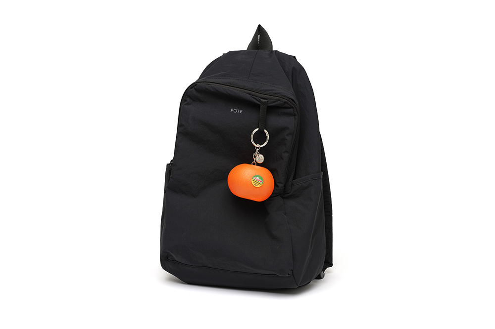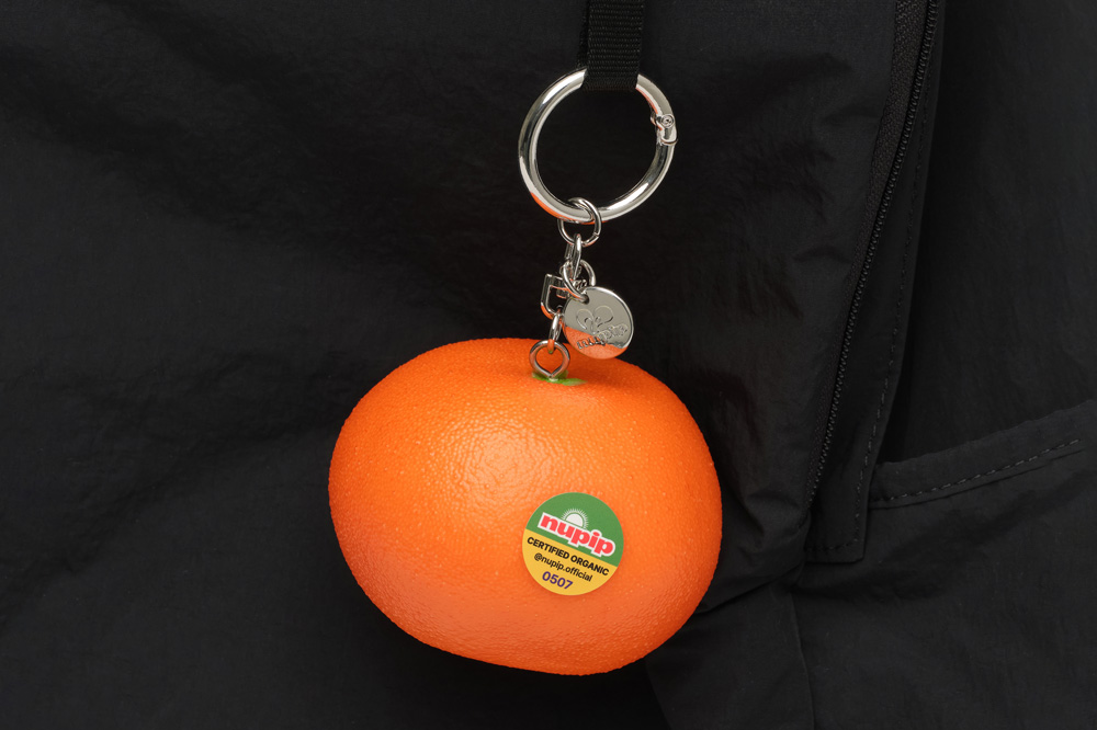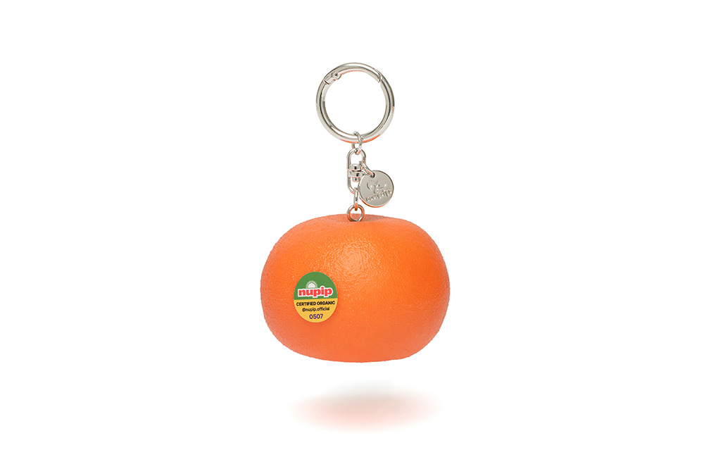 진짜 귤을 그대로 옮겨 놓은 듯한 키링입니다. 귤에 붙은 스티커와 반짝이는 누핍 로고 실버 펜던트로 디테일을 더했습니다.