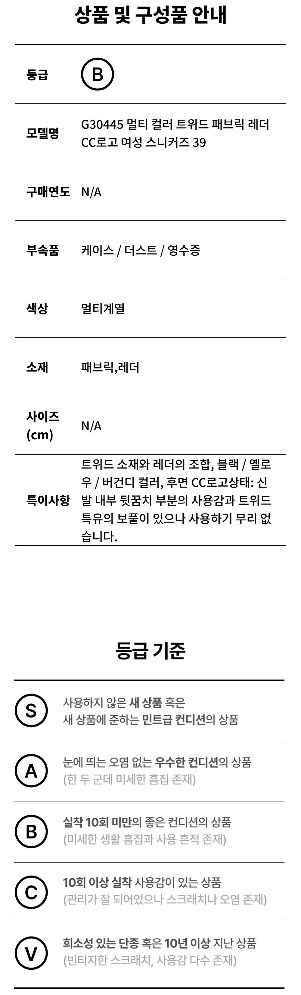 샤넬 G30445 멀티 컬러 트위드 패브릭 레더 CC로고 여성 스니커즈 39