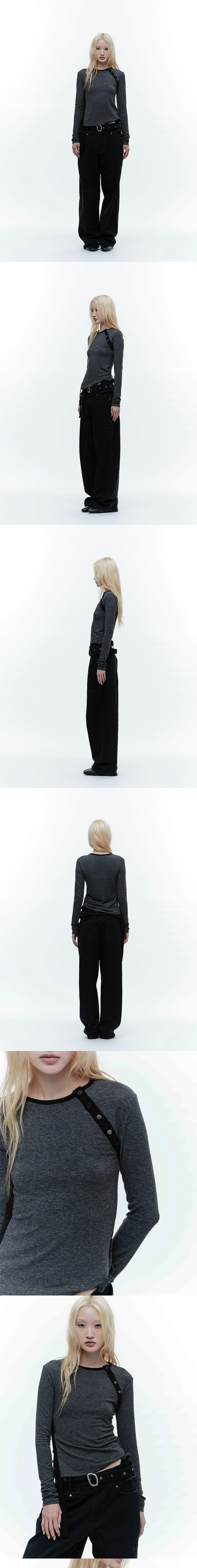 POLYESTER 56% WOOL 14% COTTON 14% TENCEL 9% SPANDEX 7% 총장 51.5cm, 어깨 40cm, 가슴 36.5cm, 소매 66.5cm, 밑단 38cm * 상세 사이즈는 단면 기준이며, 측정 방법과 위치에 따라 1~3cm 오차 범위가 생길 수 있습니다. * 모델(174cm) 피팅 사이즈 / OS 부드러운 터치감 프론트 사선 버튼 클로징 포인트 젬스톤 버튼 디테일 넥, 사이드 소재 배색 디테일 넥, 사이드 버튼으로 오픈/클로즈에 따라 다양한 핏 연출 가능 사이드 스트랩을 활용한 다양한 연출 가능 피티드핏