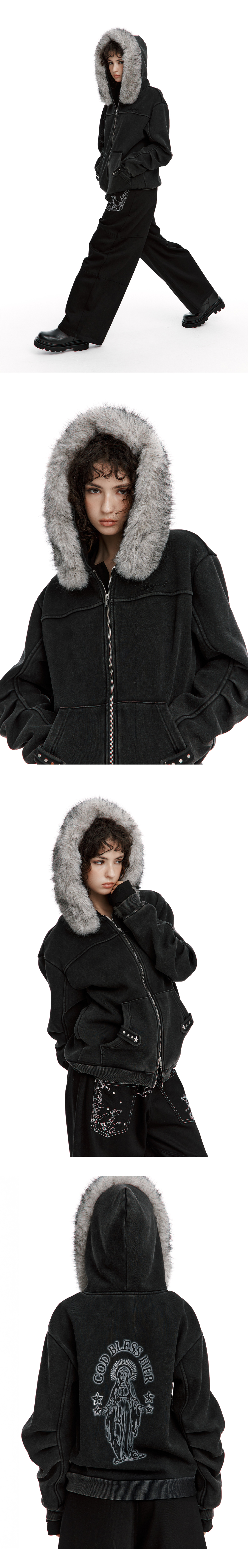 워싱이 강하게 들어가 빈티지한 톤을 연출하며, 와이드한 실루엣으로 편안한 착용감을 제공합니다. 안감은 기모 처리되어 있어 따뜻하며, 뒷면의 포인트 그래픽과 모자 부분의 트리밍이 디자인의 포인트가 됩니다. 퍼 트리밍은 탈부착이 가능하고, 투웨이 지퍼를 사용해 다양한 실루엣으로 연출할 수 있습니다.