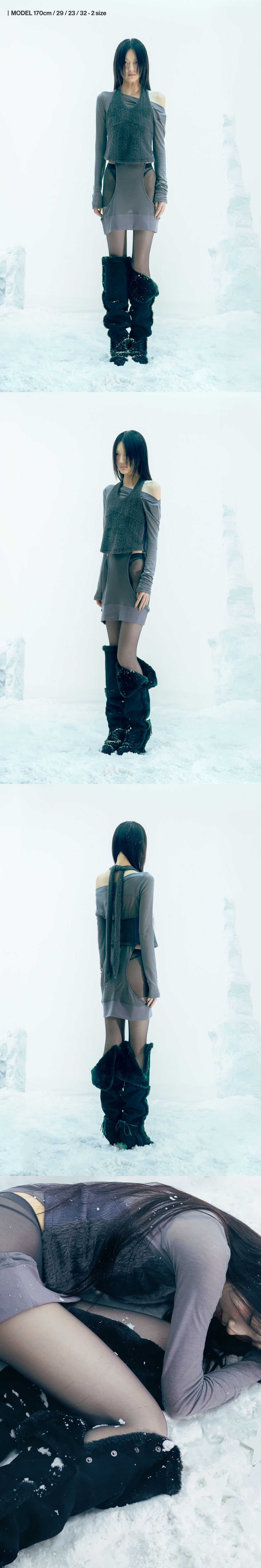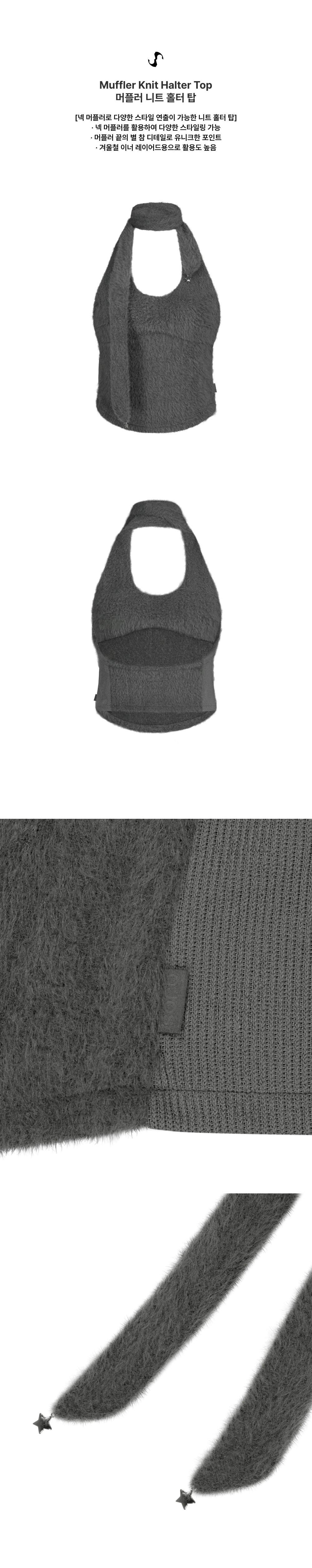 넥 머플러로 다양한 스타일 연출이 가능한 니트 홀터 탑 | 슬림핏 | 넥 머플러를 활용하여 다양한 스타일링 가능 | 머플러 끝의 별 참 디테일로 유니크한 포인트 | 겨울철 이너 레이어드용으로 활용도 높음 | 사이드 OJOS 로고 라벨 포인트상세설명 참조