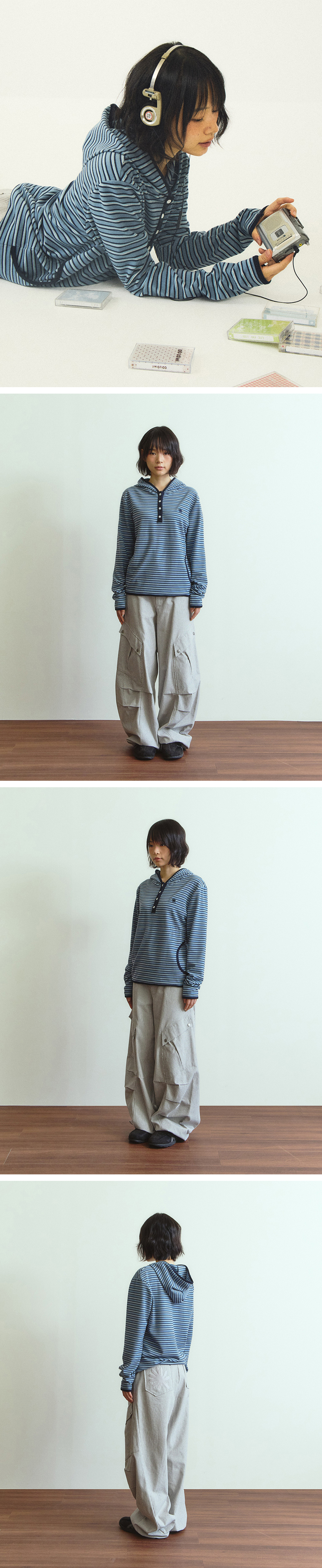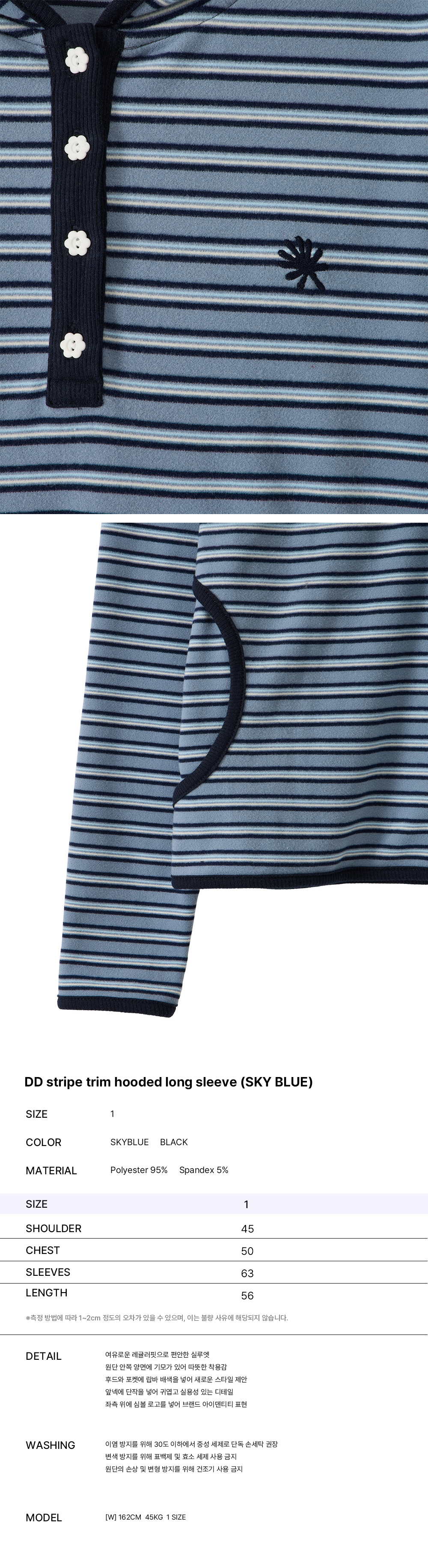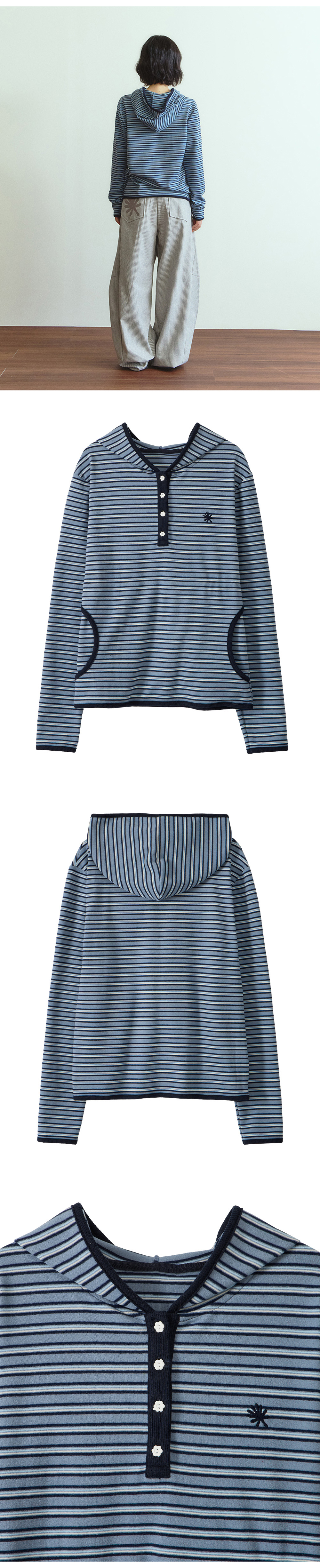 단델 스트라이프 트림 후드 롱슬리브 스카이블루
