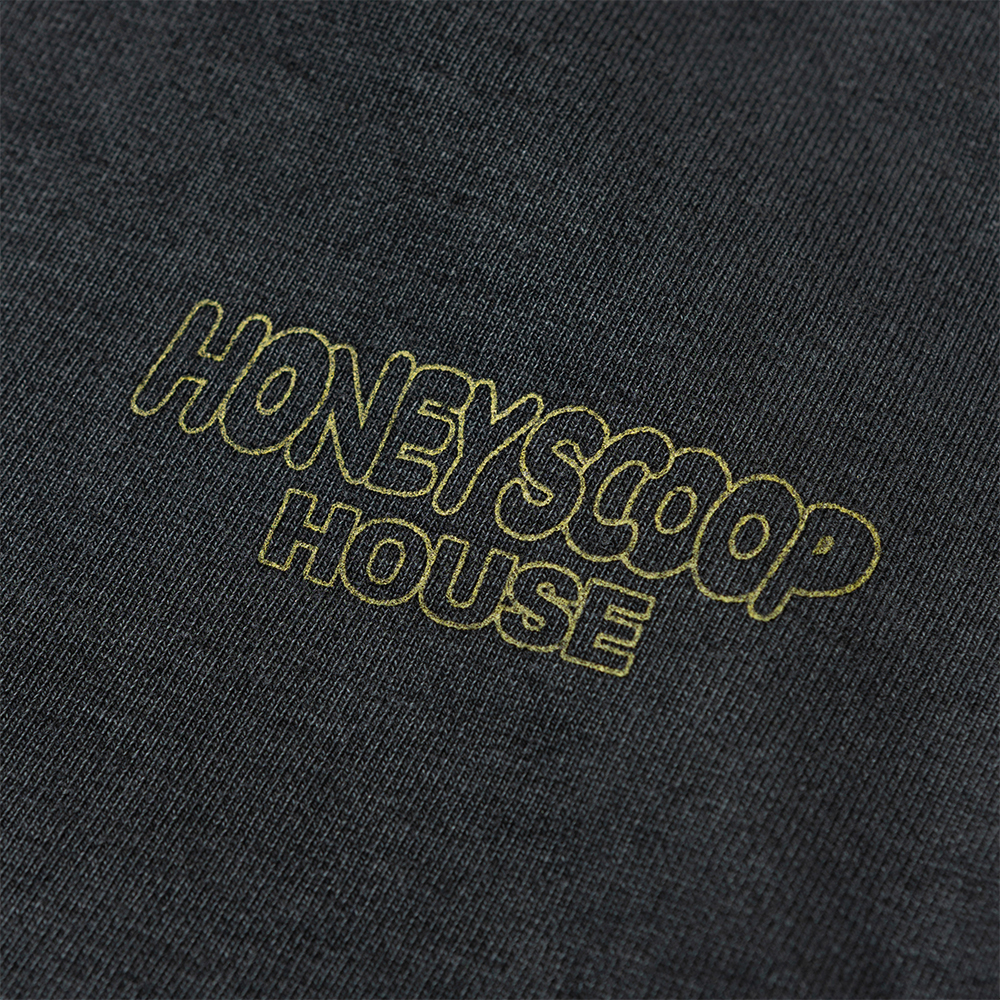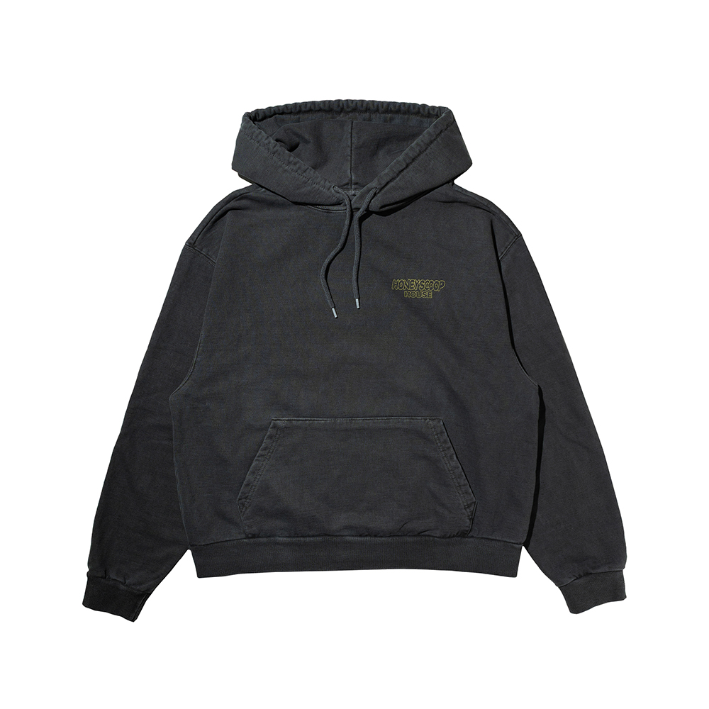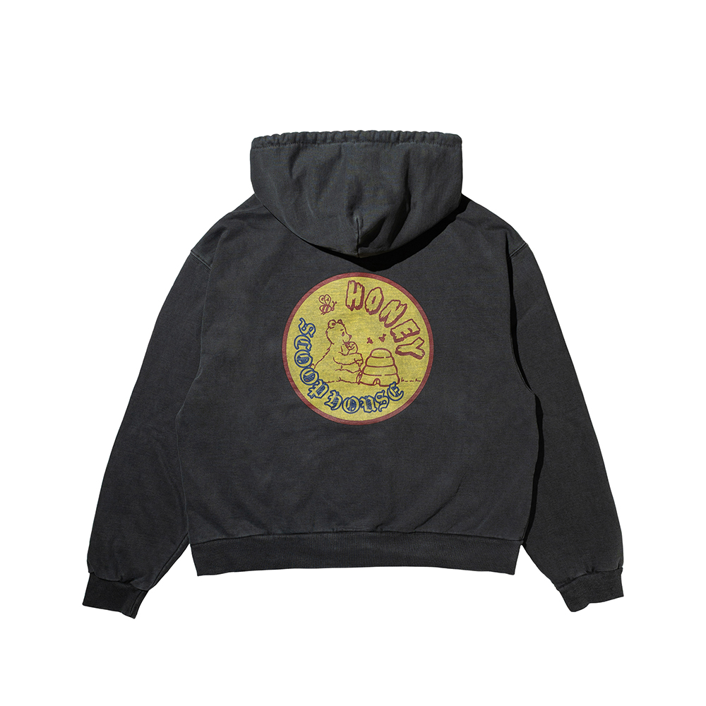 HONEY SCOOP HOUSE HONEY BEAR OVERDYED HOODED SWEATSHIRT CHARCOAL 100% COTTON RIBBED CUFFS AND HEM UNISEX RELAXED FIT