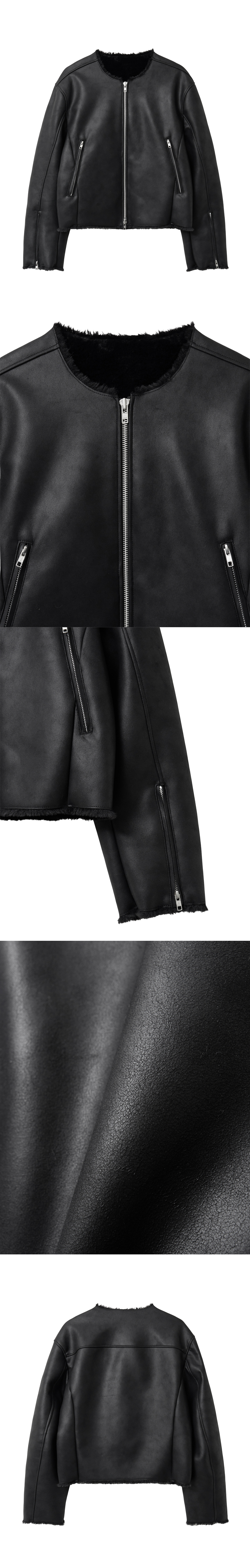 페이크 무스탕 소재로 제작된 카라리스 크롭 재킷입니다. 매트한 텍스처의 페이크 레더 외피와 부드러운 페이크 퍼 안감이 대비되는 질감을 형성합니다. 넥라인, 밑단, 소맷단은 컷오프 마감으로 처리해 자연스러운 텍스처를 강조하며, 레귤러한 핏의 크롭 실루엣으로 구조적인 밸런스를 완성했습니다. -DETAIL- 레귤러 핏 크롭 실루엣 매트한 텍스처의 인조가죽 페이크 퍼 안감 넥·밑단·소맷단 컷오프 마감 프런트 투웨이 지퍼 여밈 지퍼 포켓 소매 지퍼 디테일