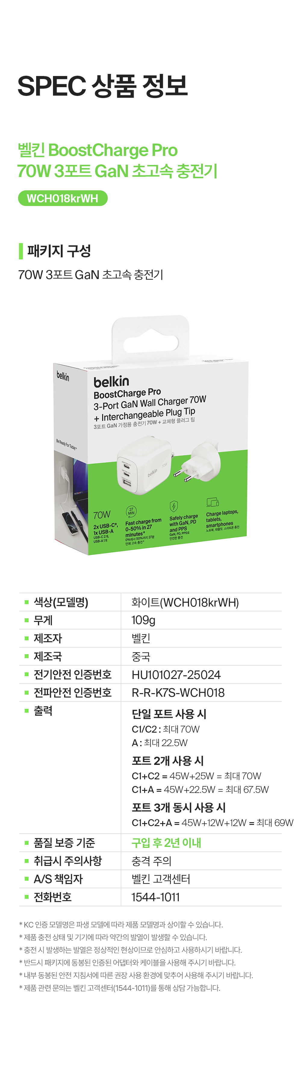 벨킨 70W 3포트 초고속 충전기 WCH018