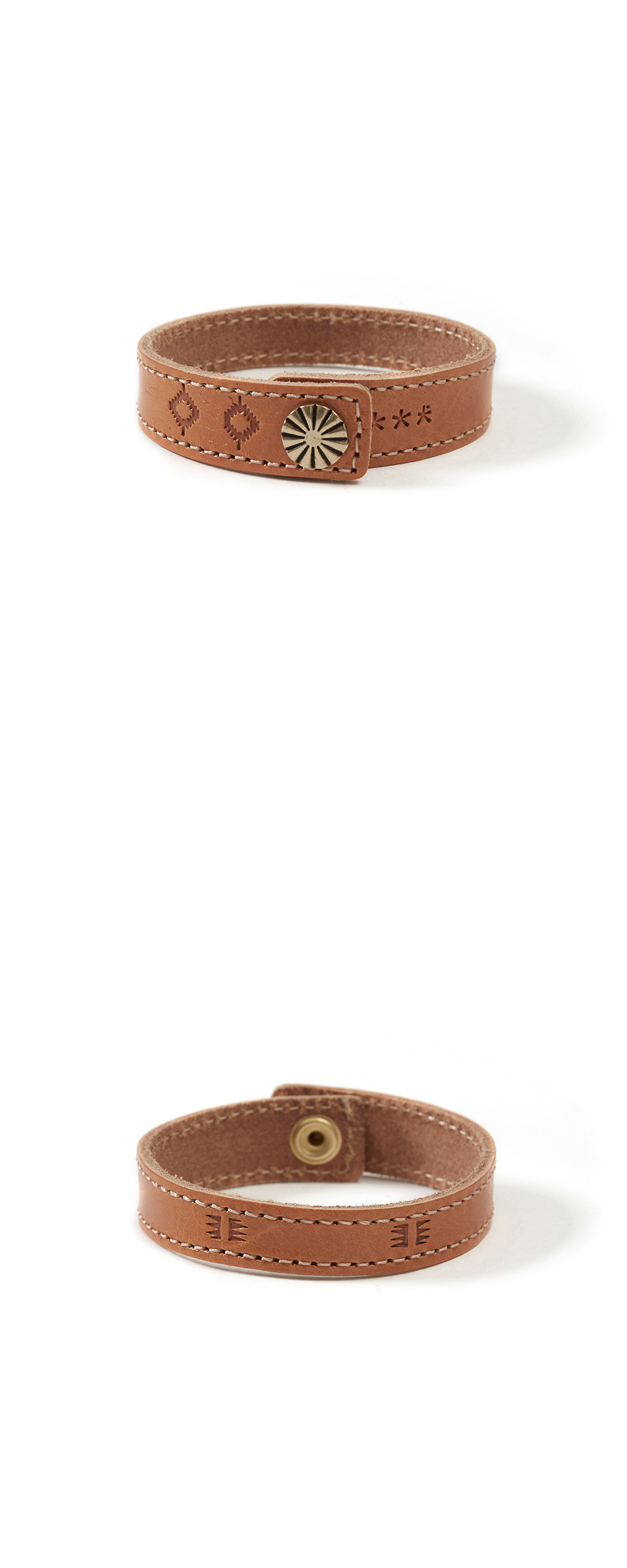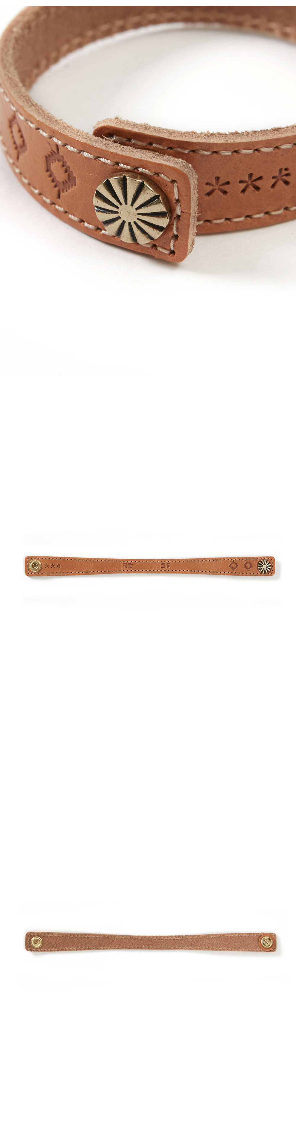 Product Info. - 이탈리아 베지터블 레더 소재의 뱅글 - 사용자의 생활 환경에 따라 에이징이 이루어지는 내추럴 레더 - 핸드 크래프트 기조의 스탬핑 디자인 - Real bronze 소재의 콘초 장식 사용 - 바디 스티치 디테일