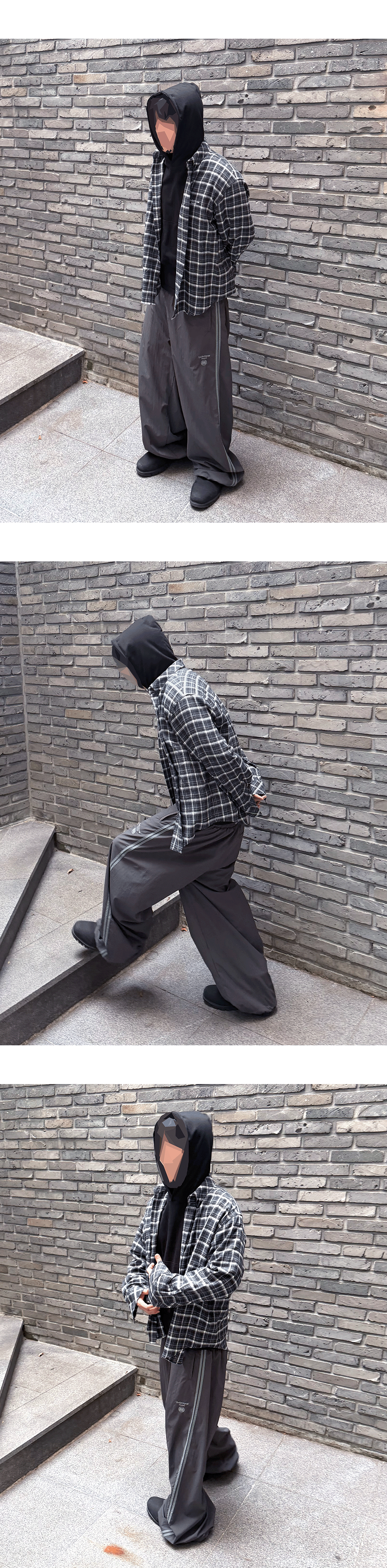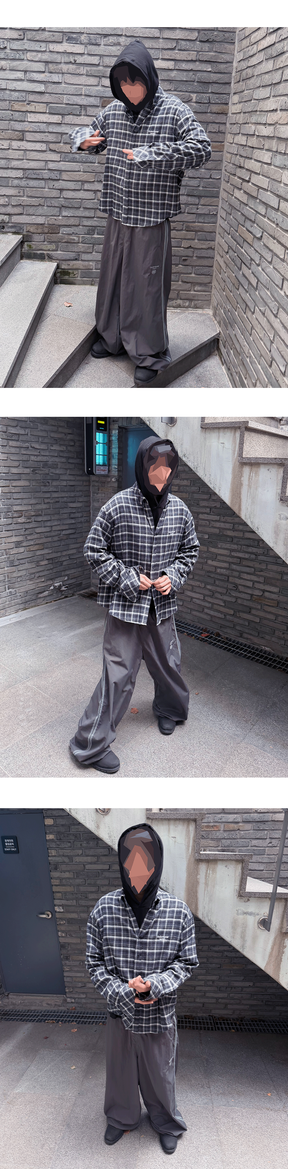 Model spec - 178cm / 70kg ( Size 1 착용) 상의 – Mu.155 Classic Logo Basic Long Sleeve Flannel Shirts Navy White - Size 1 이너 - Mu.96 Anti Fxxking Logo Play Light Cropped Hoodie Black – Size 1 하의 – Mu.149 Combi Side Double Line Nylon Track Pants Ash Gray – Size 1