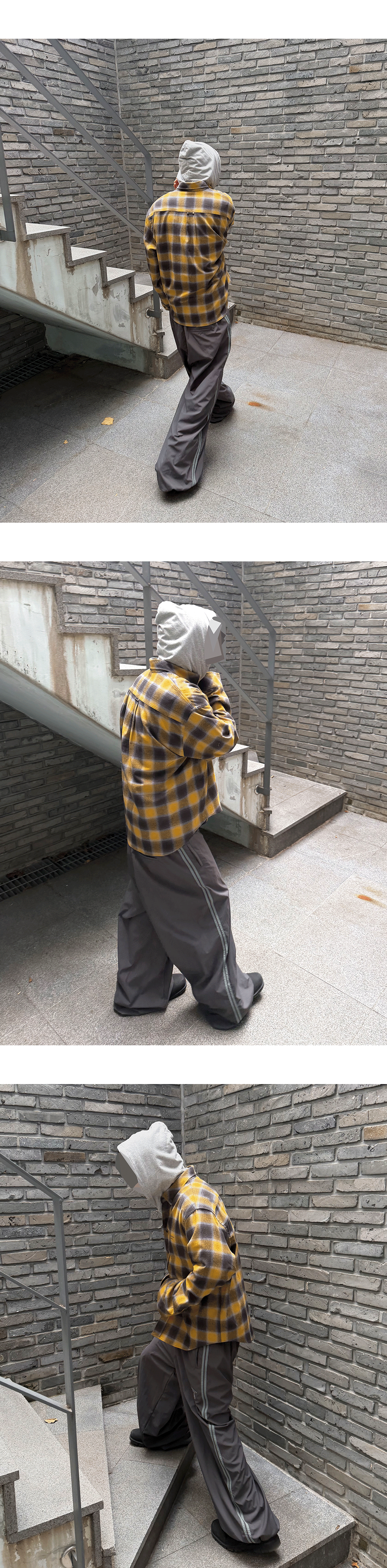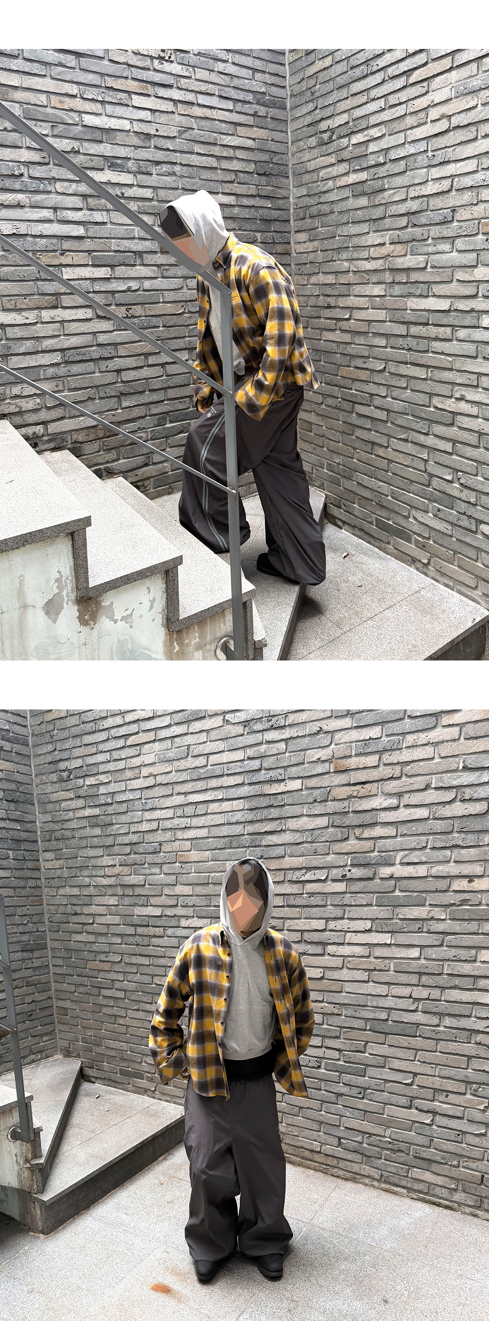 Model spec - 178cm / 70kg ( Size 1 착용) 상의 - Mu.154 Classic Logo Basic Long Sleeve Flannel Shirts Mustard Gray – Size 1 이너 - Mu.96 Anti Fxxking Logo Play Light Cropped Hoodie Melange Gray – Size 1 하의 – Mu.149 Combi Side Double Line Nylon Track Pants Ash Gray – Size 1