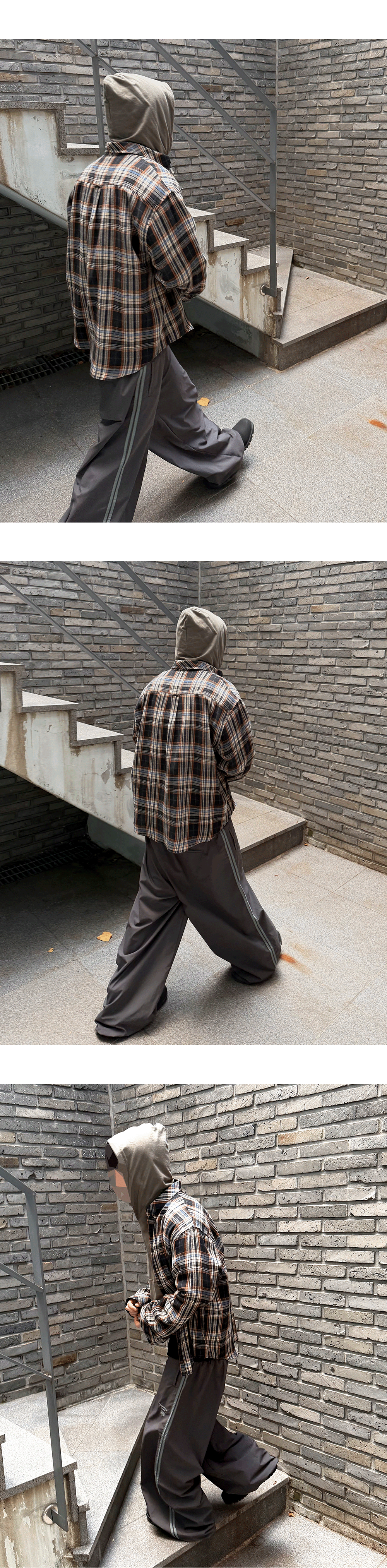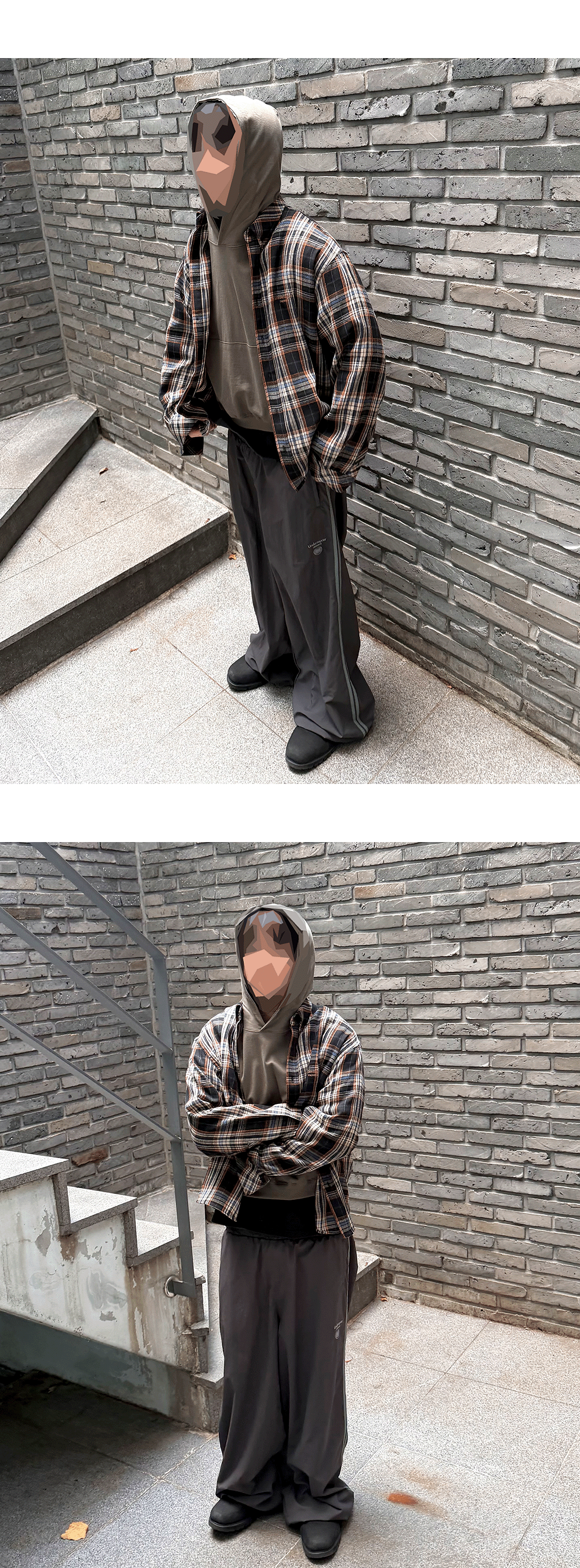 Model spec - 178cm / 70kg ( Size 1 착용) 상의 – Mu.153 Classic Logo Basic Long Sleeve Flannel Shirts Black Orange - Size 1 이너 - Mu.96 Anti Fxxking Logo Play Light Cropped Hoodie Olive – Size 1 하의 – Mu.149 Combi Side Double Line Nylon Track Pants Ash Gray – Size 1