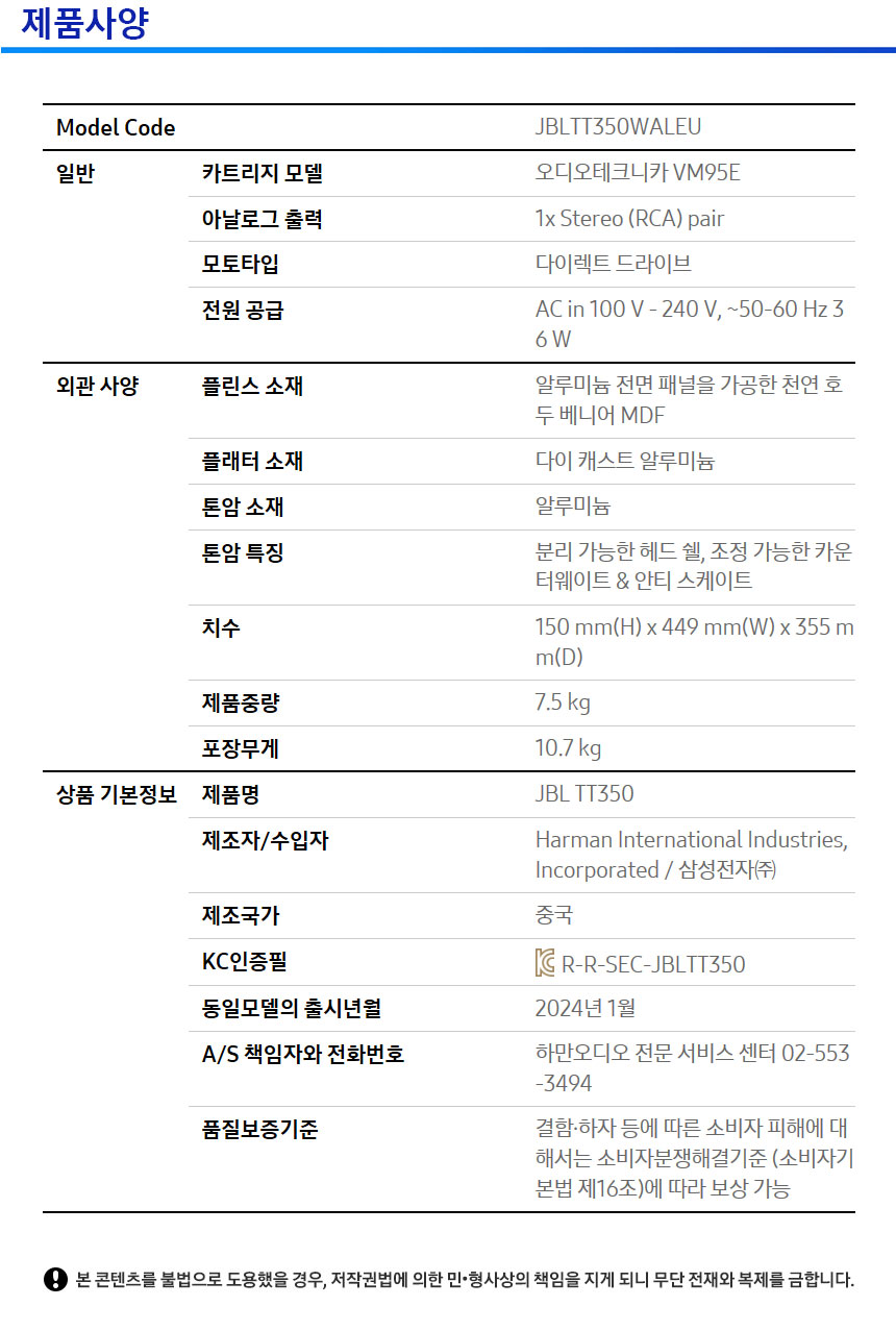 제이비엘 TT350 턴테이블 바이닐 레코드 LP 플레이어