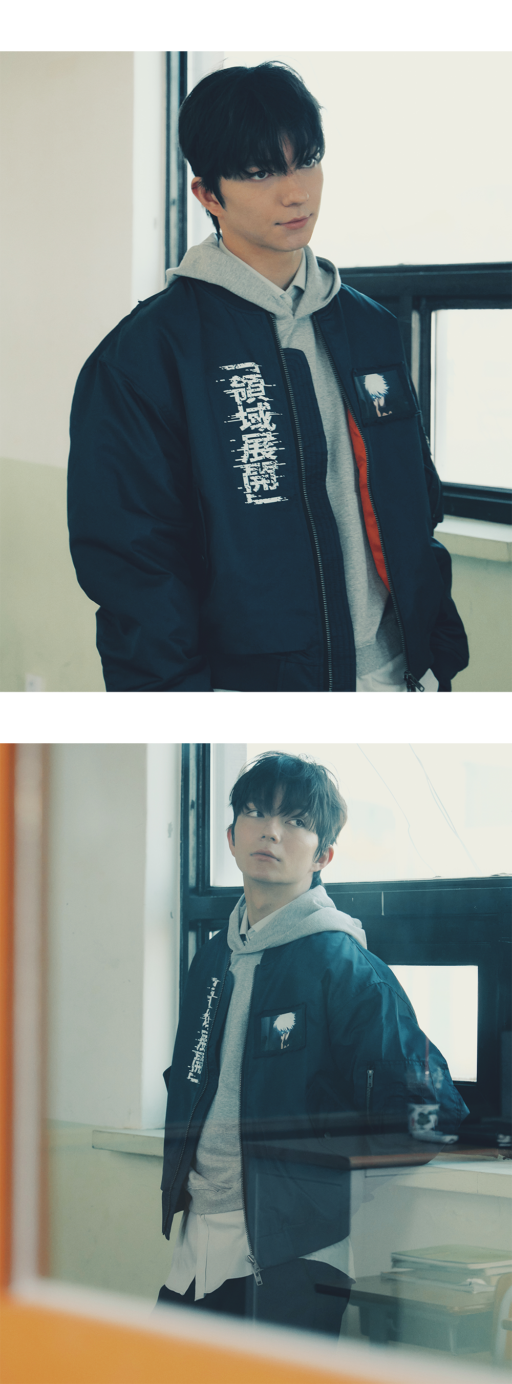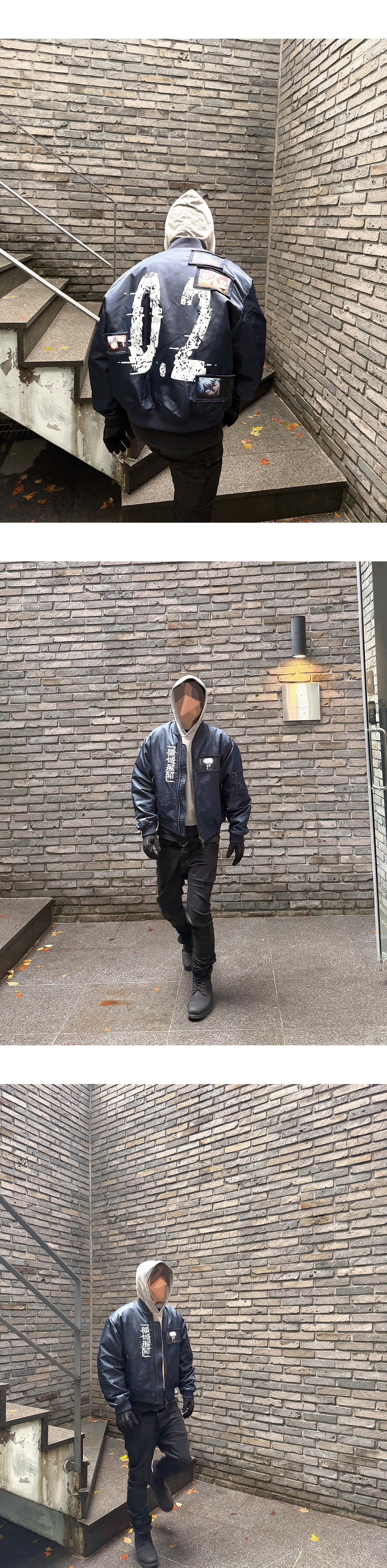 고죠의 0.2초 영역 전개를 그래픽과 패치워크로 재해석한 나일론 MA-1입니다. Model spec - 178cm / 70kg 아우터 - Gojo Satoru Graphic Patch MA-1 Navy - Size 2 이너 - Mu.96 Anti Fxxking Logo Play Light Cropped Hoodie Melange Gray - Size 1 하의 -Black Mamba Slim Fit Red Stitch Wax Coating Jeans Rumba Red – Size 1 ACC - 25FW Ouroboros Loop Buckle Calf Hair Leather Belt Cheetah Green