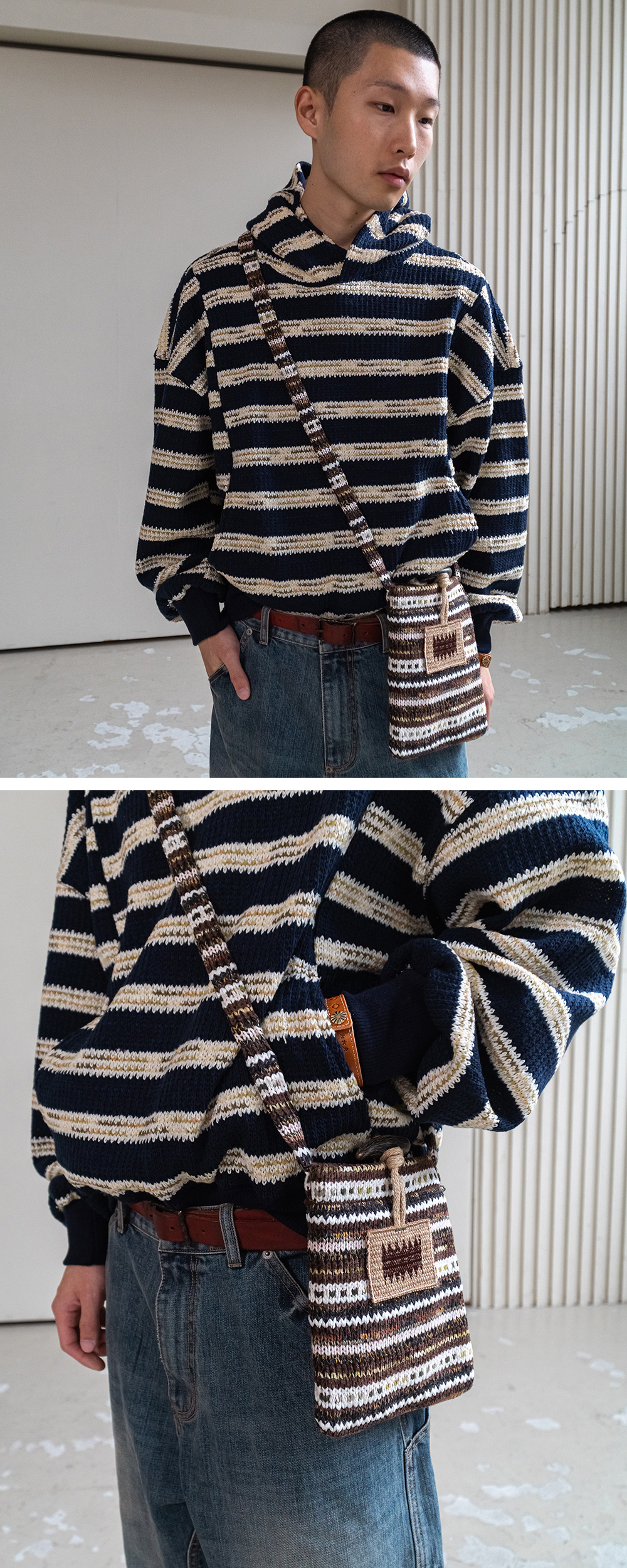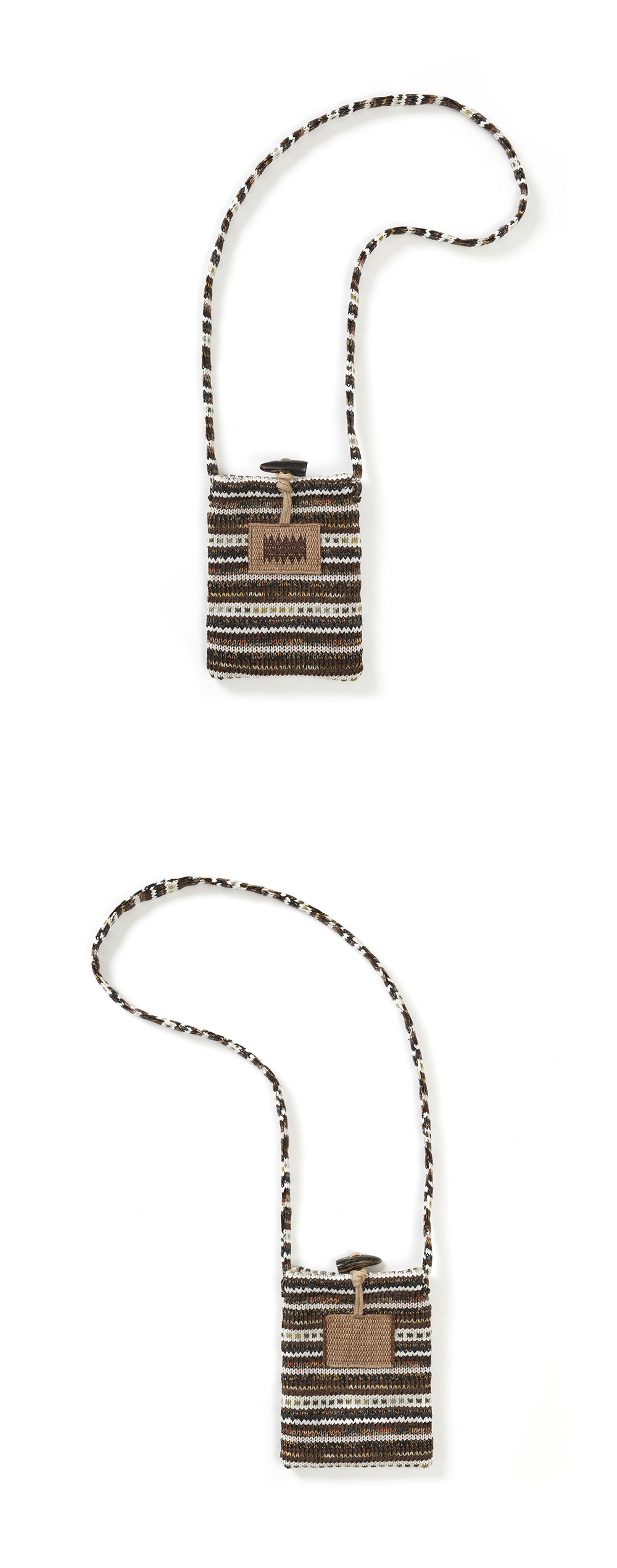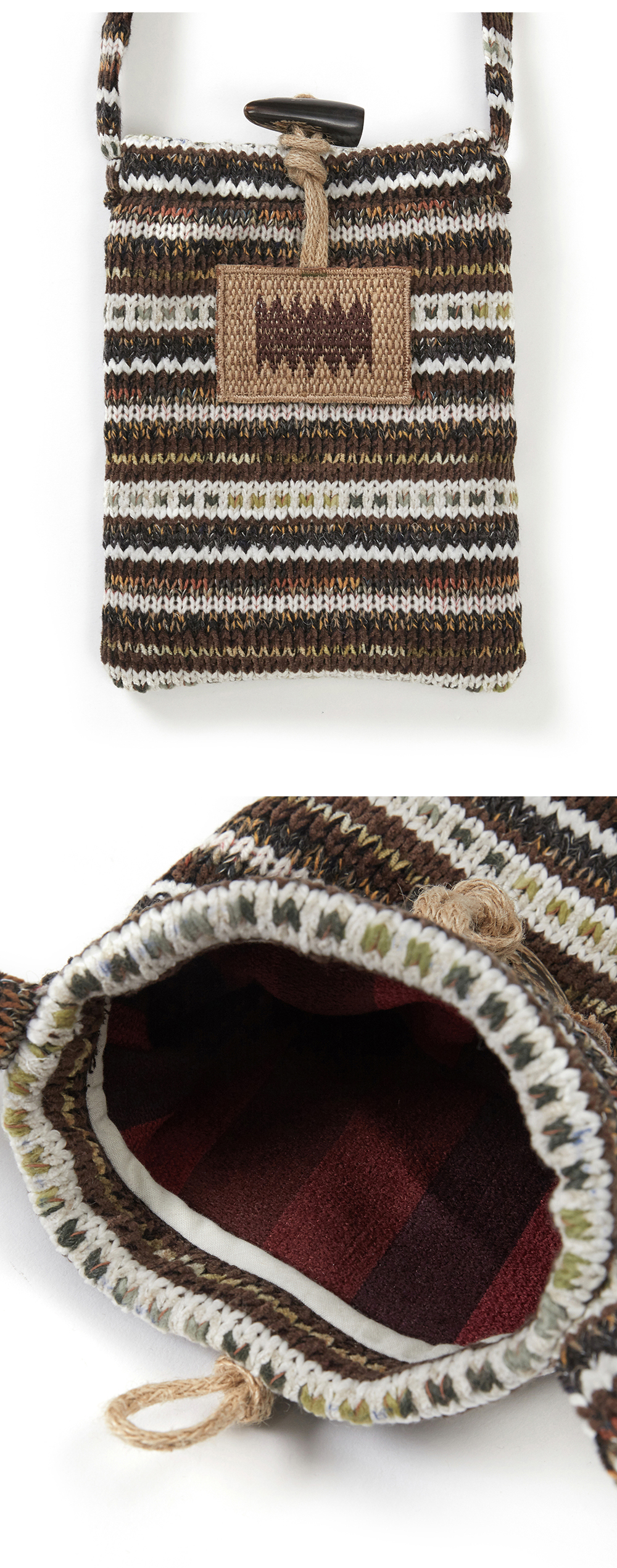Product Info. - 다양한 원사를 믹스해 짜여진 텍스처가 돋보이는 니트 사코슈 백 - 데일리 소지품을 담기 좋은 컴팩트한 사이즈로 크로스/숄더 모두 연출 가능 - 소뿔 토글과 황마 자수 라벨로 완성된 러스틱한 디테일 - 부드럽지만 탄탄한 니트 조직으로 가벼운 무게와 유연한 착용감 제공 - 내부 레이어드 된 레드 패턴 라이닝 포인트