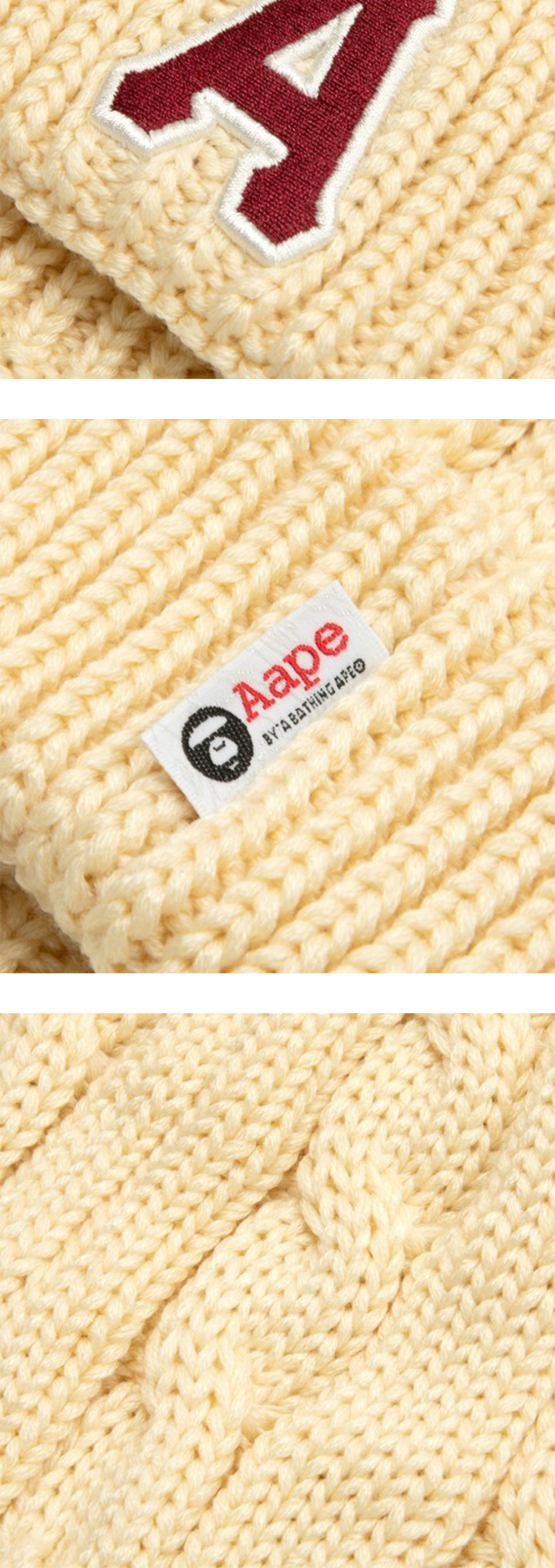 에이프 메인 햇 아이보리입니다. - 아크릴 소재의 따뜻한 니트 모자 - 'A' 원포인트 로고 와펜 패치 - 가볍고 부드러운 착용감 ✧ AI로 제작한 콘텐츠가 포함되었습니다.