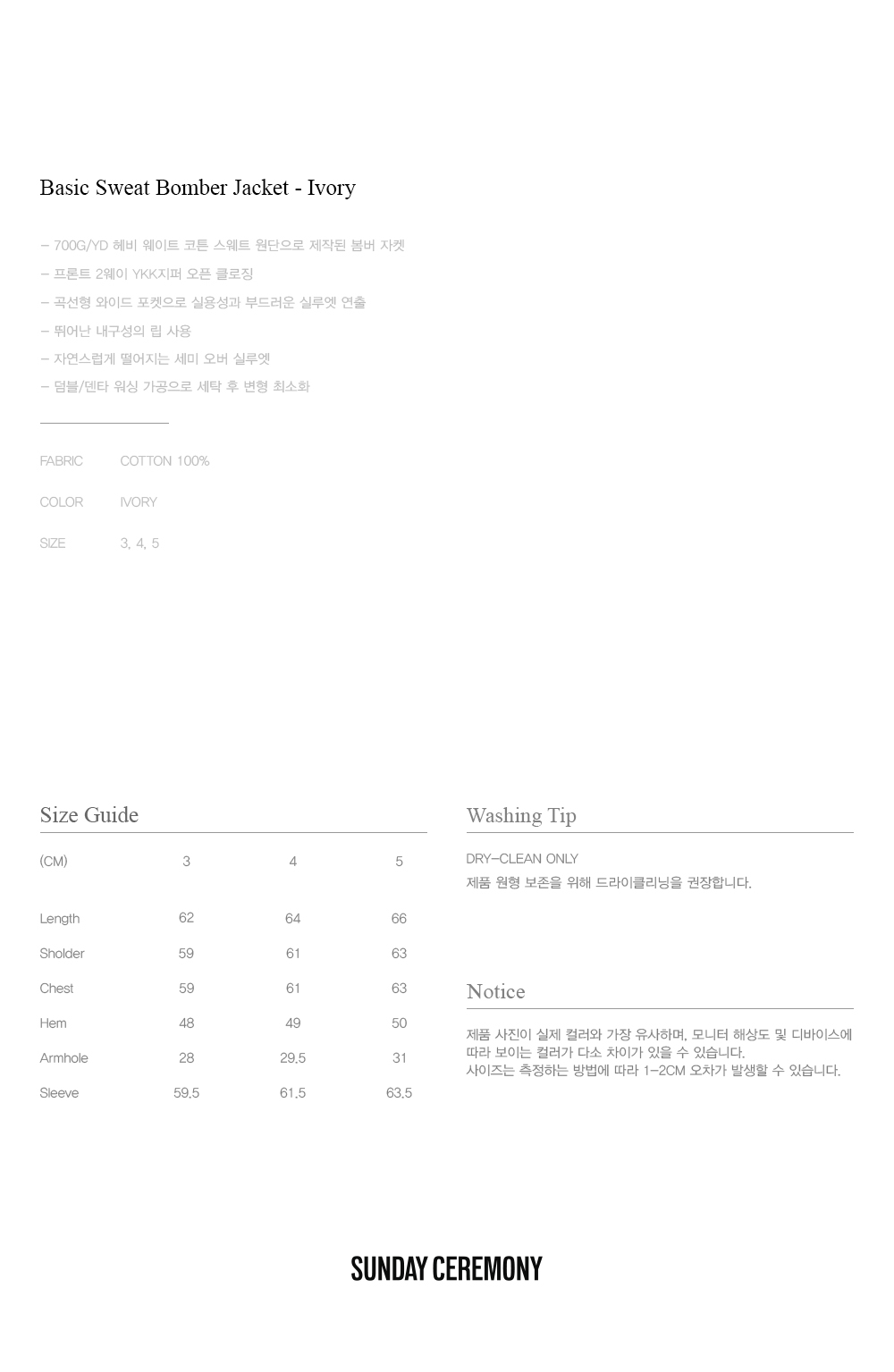선데이세레머니 베이직 스웻 봄버 자켓 - 아이보리
