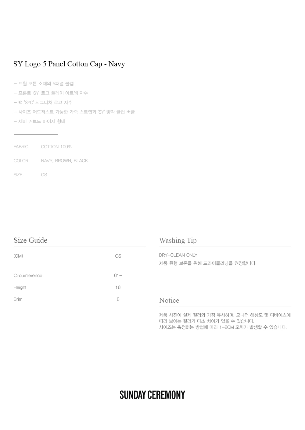[예약 배송] 선데이세레머니 SY 로고 5패널 코튼 캡 - 네이비