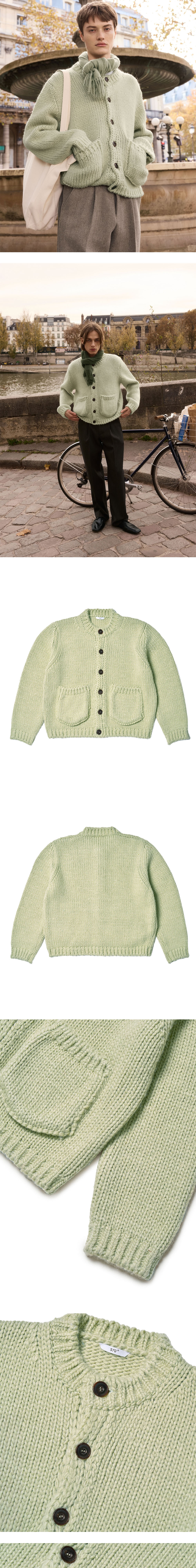 - 스탠다드 핏 - 라운드넥 가디건 실루엣 - 입체 포켓 디테일 - 로고 각인 소뿔 단추